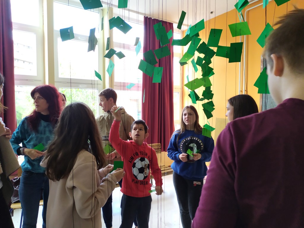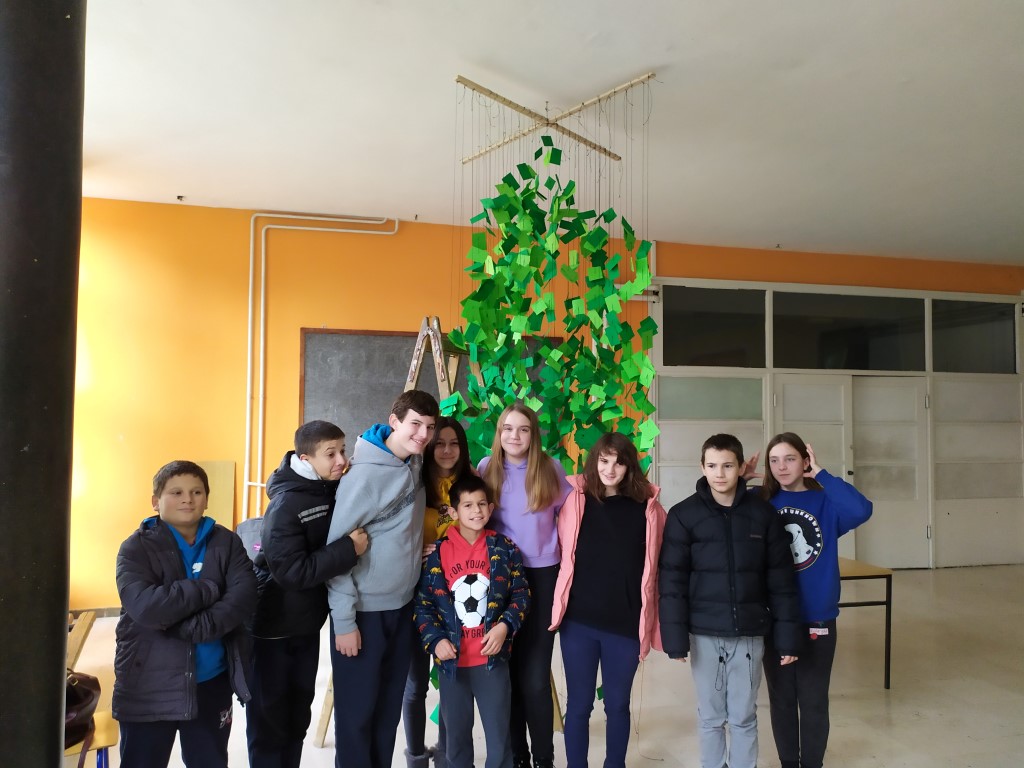 Učenici su tijekom dva školska sata zajednički izradili božićnu jelku od zelenih papirića kroz koje su provlačili konopce na unaprijed pripremljenoj instalaciji u predvorju škole. Osim radnih zadataka, učenici su uživali i u međusobnom druženju, a neki su u trenutcima odmora zaigrali i stolni tenis.