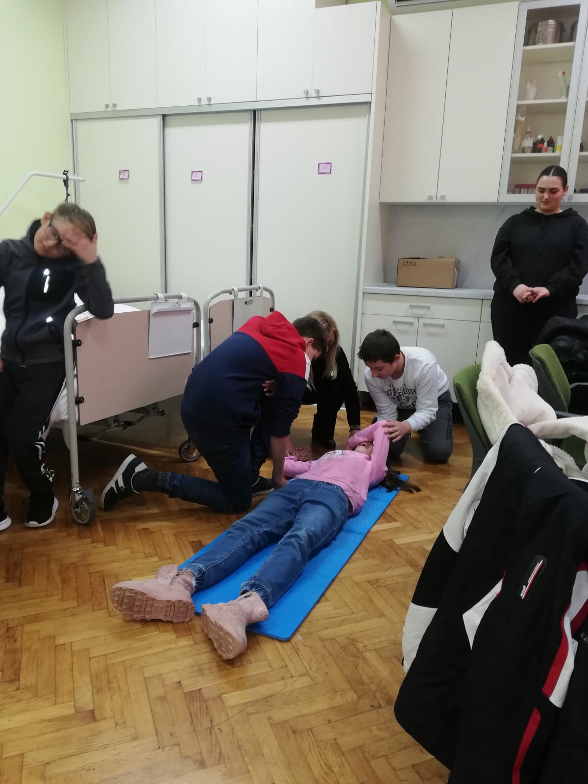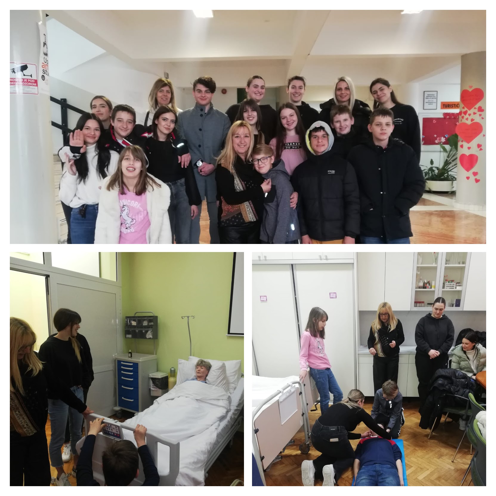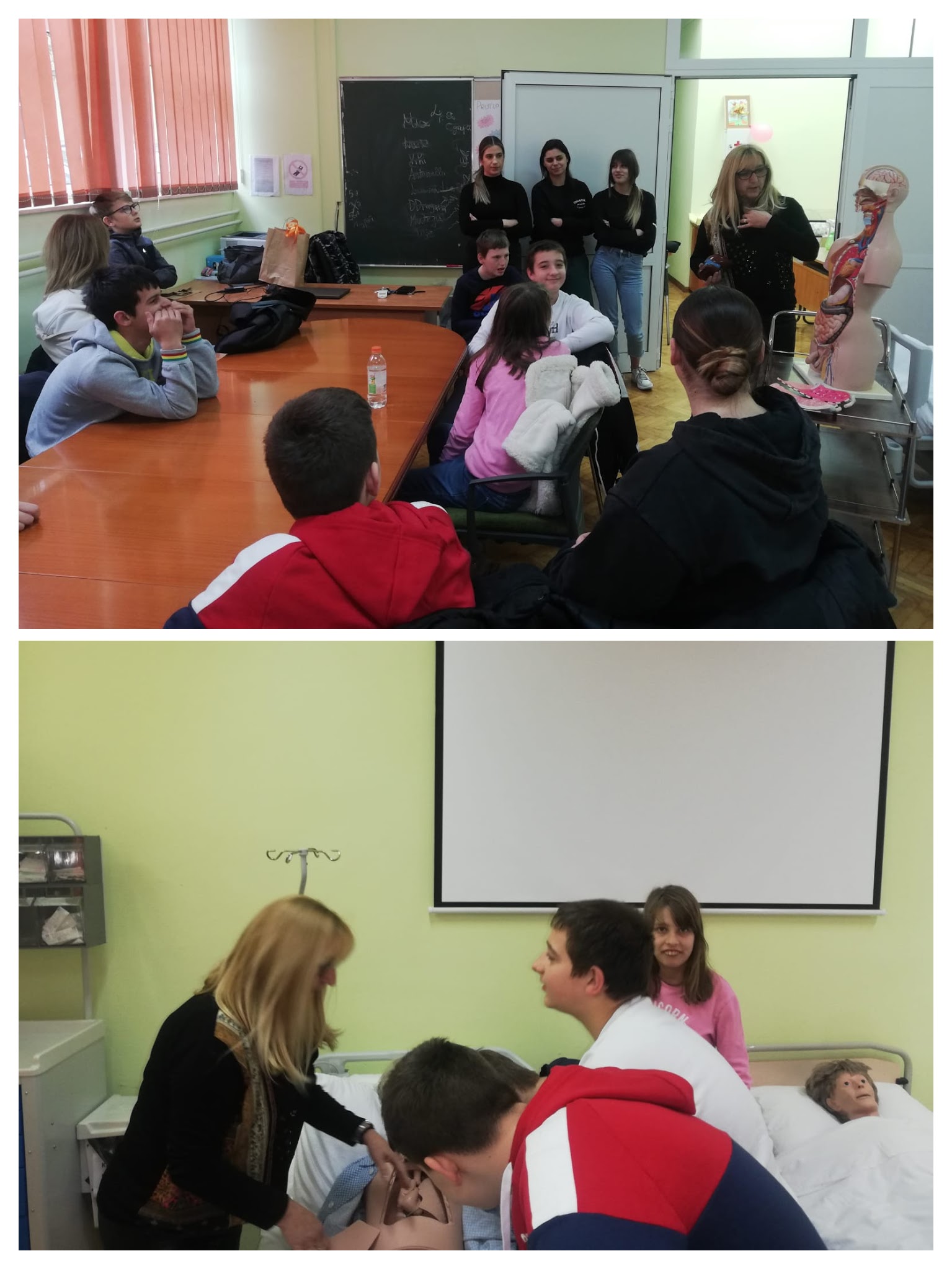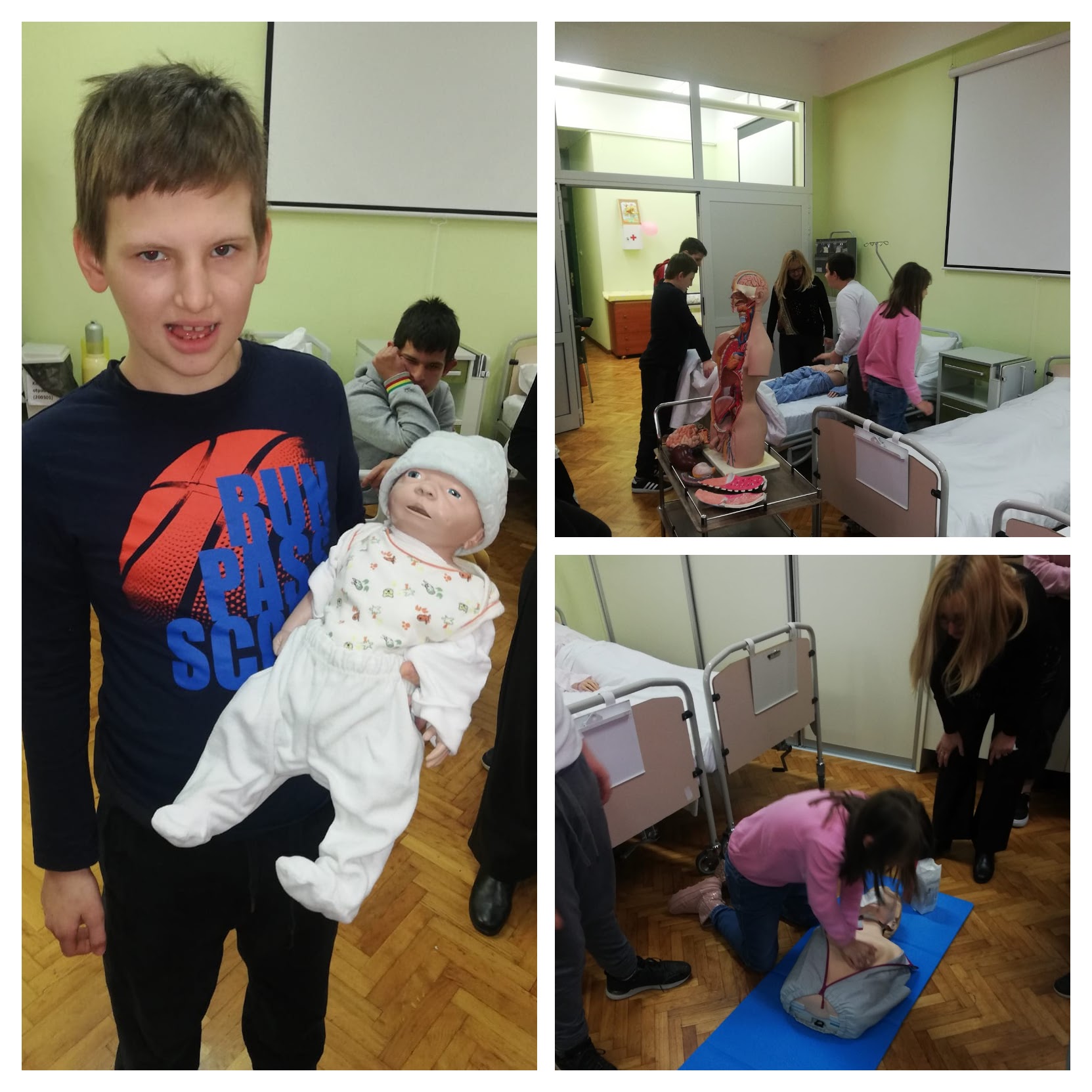 Dočekla ih je nastavnica Snežana Žaja i njezini učenici. Skupa su obišli kabinet, na modelu ponovili ono što već znaju, a zatim sudjelovali u demonstraciji pružanja prve pomoći i davanja umjetnog disanja.