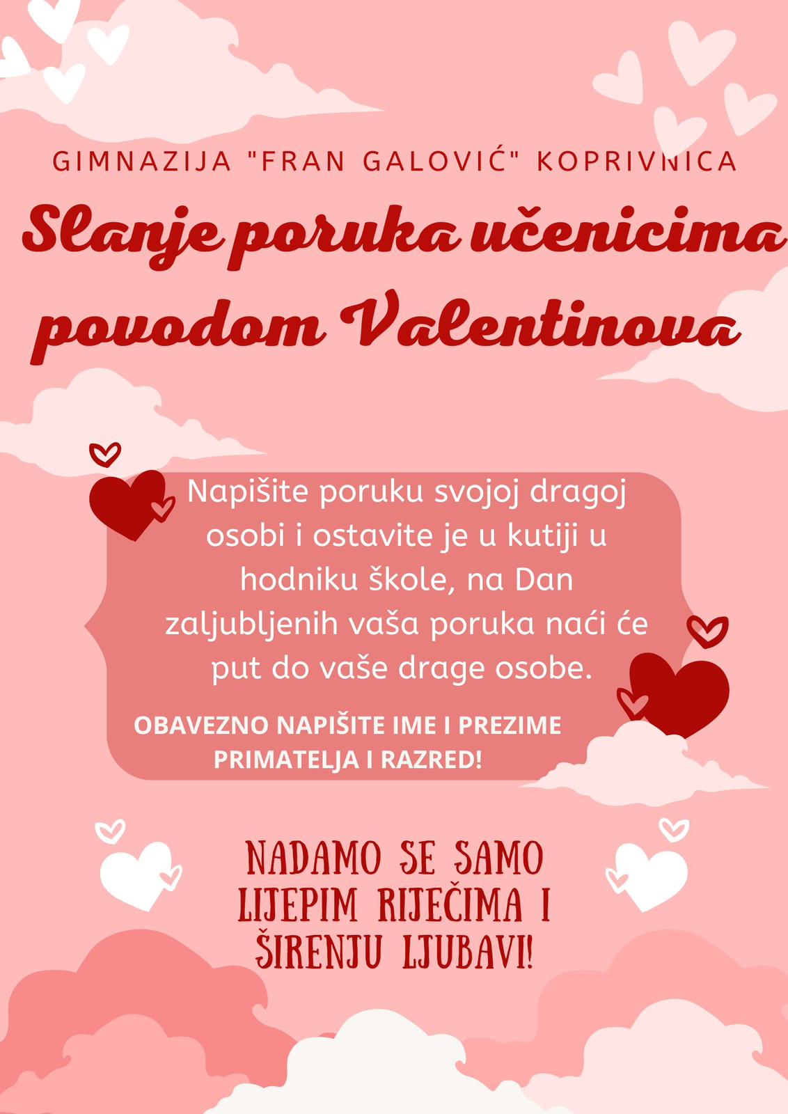 Pozivamo sve učenike škole na sudjelovanje u slanju anonimnih ili neanonimnih porukica povodom Valentinova u našoj školi. Sve što je trebate učiniti je napisati poruku ili ostaviti poklončić u kutiji na hodniku škole koji će na Dan zaljubljenih biti dostavljen Vašoj dragoj osobi. Molimo vas da napišete ime i prezime učenika kome šaljete i razred. Nadamo se samo lijepim riječima i širenju ljubavi!
