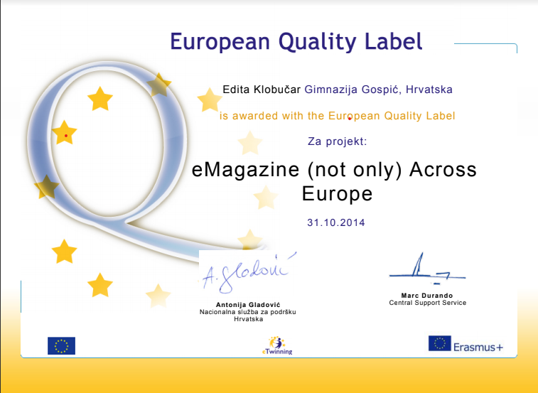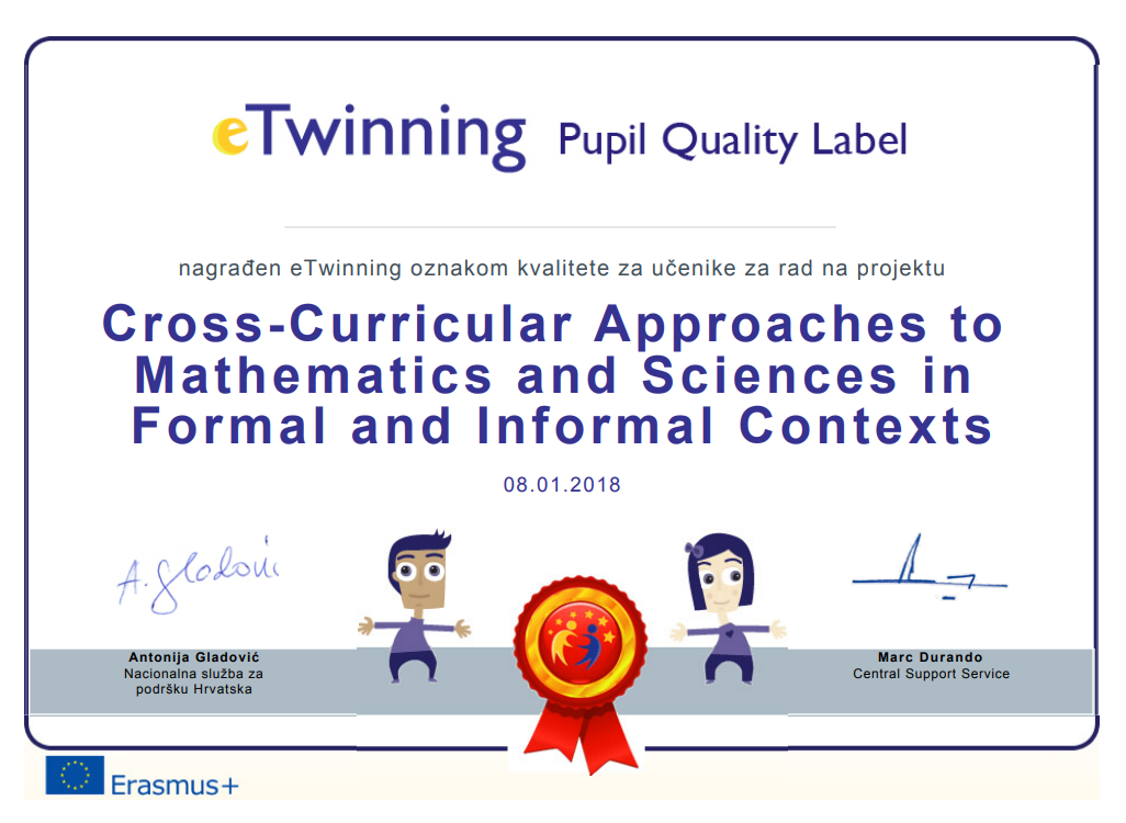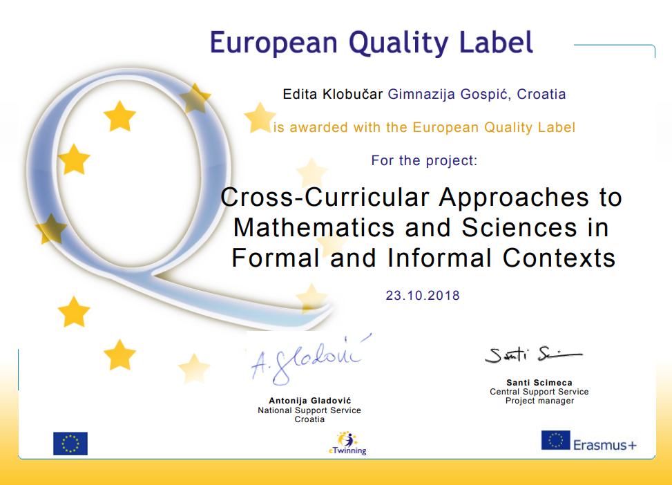 Za sve ove projekte osvojili smo National Quality Label, a za projekt Cross-Curricular Approaches to Mathematics and Sciences in Formal and Informal Contexts osvojili smo European Quality Label.