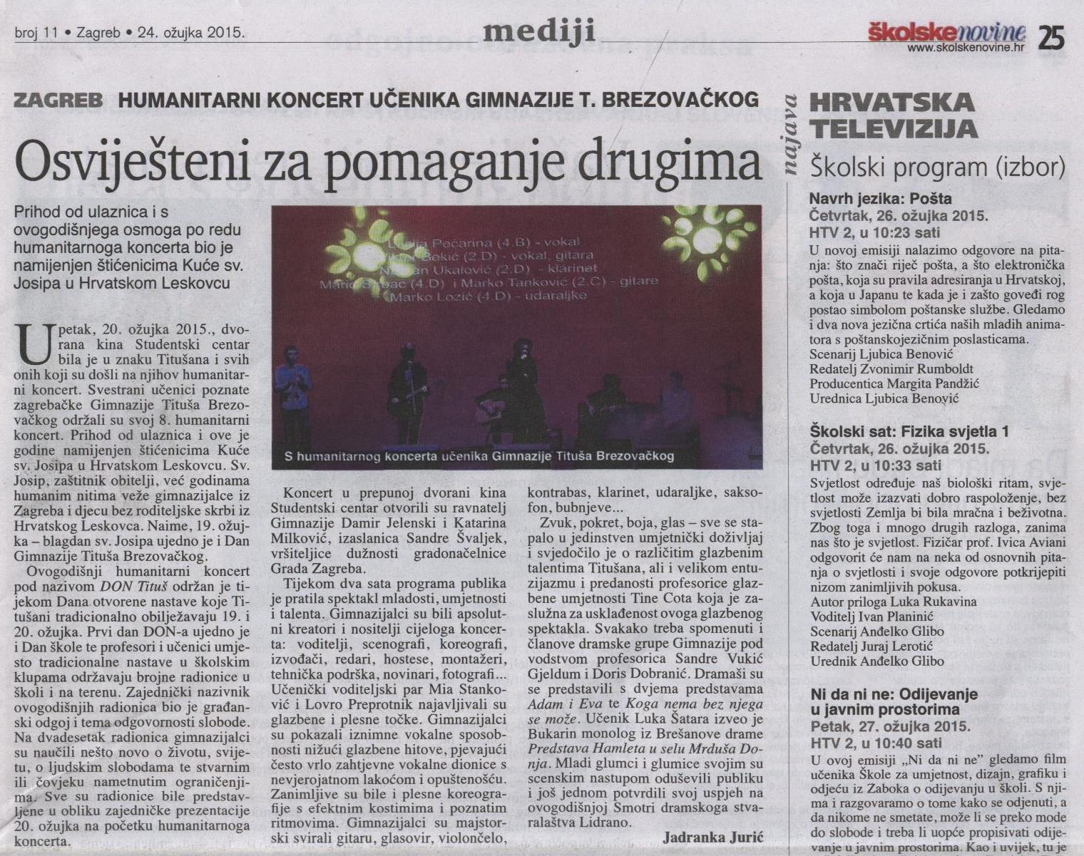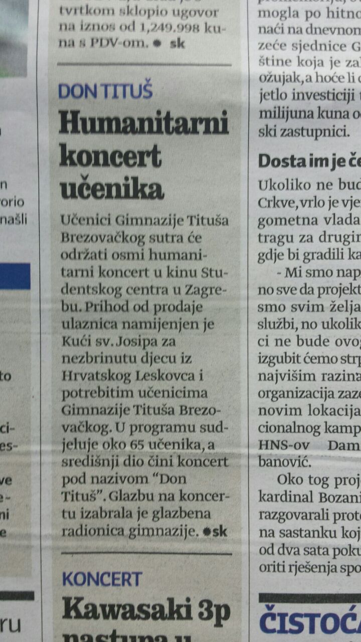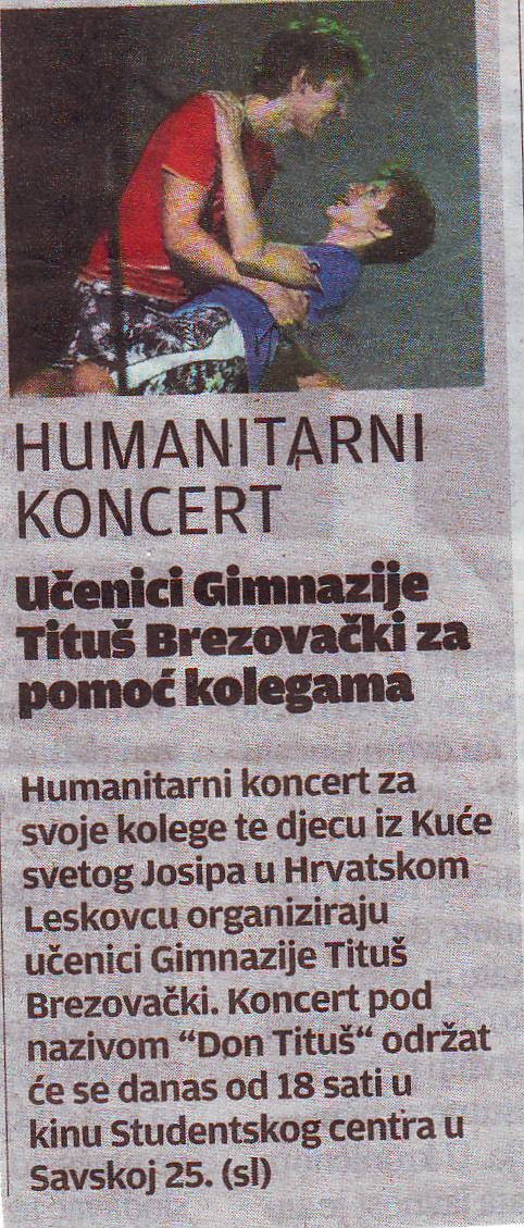 Učenici Gimnazije Tituša Brezovačkog pomažu vršnjacima iz Kuće svetog Josipa i kolegici. U dvorani kina Studentskog centra u petak 21. ožujka u 18 sati će, u povodu Dana škole, izvesti autorsku predstavu Bilo jednom u Titušu, te održati humanitarni koncert. Nadaju se posjetu 1000 ljudi.