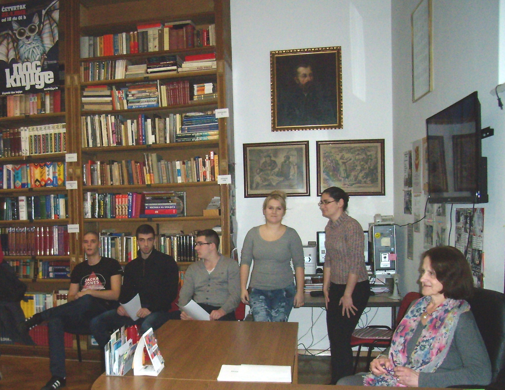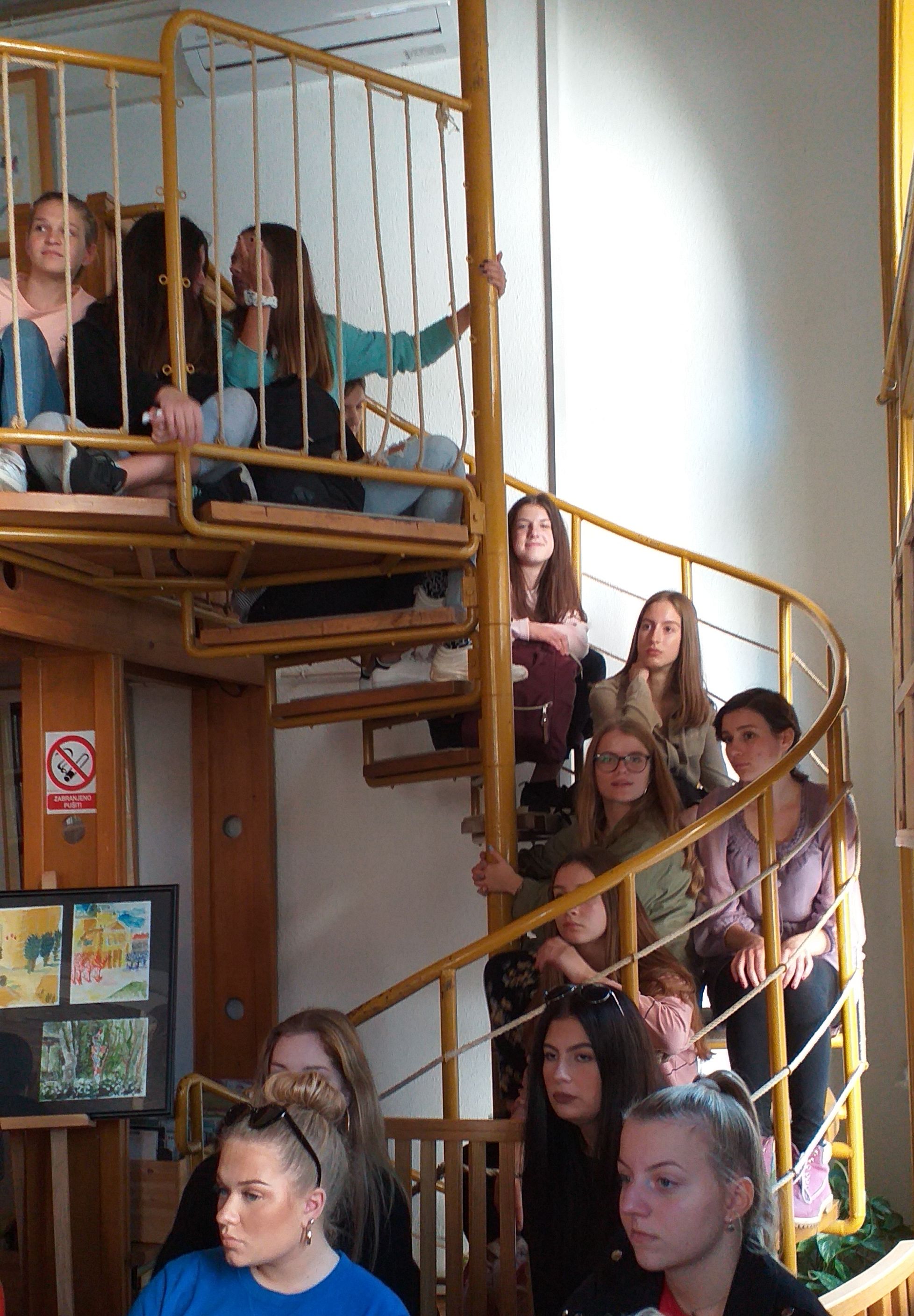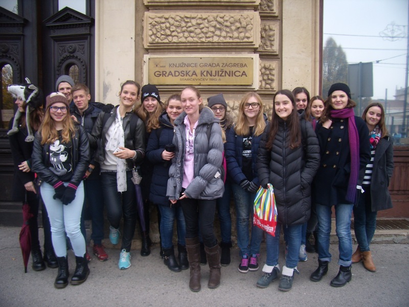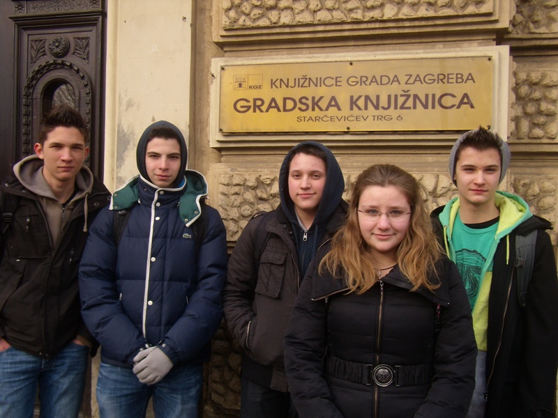 Učenici prvih razreda posjetili su odjele Gradske knjižnice na Starčevićevu trgu 6. Ljubazna djelatnica Knjižnice ukratko nas je upoznala s poviješću Knjižnice i lokacijama na kojima je bila smještena sve do današnjih dana. Prvo smo se zadržali na Informativno-posudbenom odjelu u kojem smo pretraživali građu na računalima. Dobili smo informaciju kako možemo koristiti usluge Knjižnice za prikupljanje literature za potrebe pisanja referata. Posjetili smo Studijsku čitaonicu u kojoj je smještena građa referentne zbirke i zbirke iz povijesti umjetnosti. Razgledali smo Čitaonicu novina i časopisa te Glazbeni odjel. O svakom odjelu saznali smo kakvu građu sadrži, čemu služi i koje mogućnosti pruža nama korisnicima. Zavirili smo i u spremište knjiga u podrumu zgrade. Tamo se nalaze knjige, složene po stručnim oznakama, koje na zahtjev korisnika dolaze u Posudbeni odjel. Dječji odjel Gradske knjižnice nalazi se u istoj zgradi, ali na drugome ulazu i sadrži bogatu medioteku. Velika zbirka knjiga u Gradskoj knjižnici umjesto sadašnjih 2 000 m2 treba prostor od 20 000 m2. Iskreno se nadamo da će taj prostor u skoroj budućnosti i dobiti.