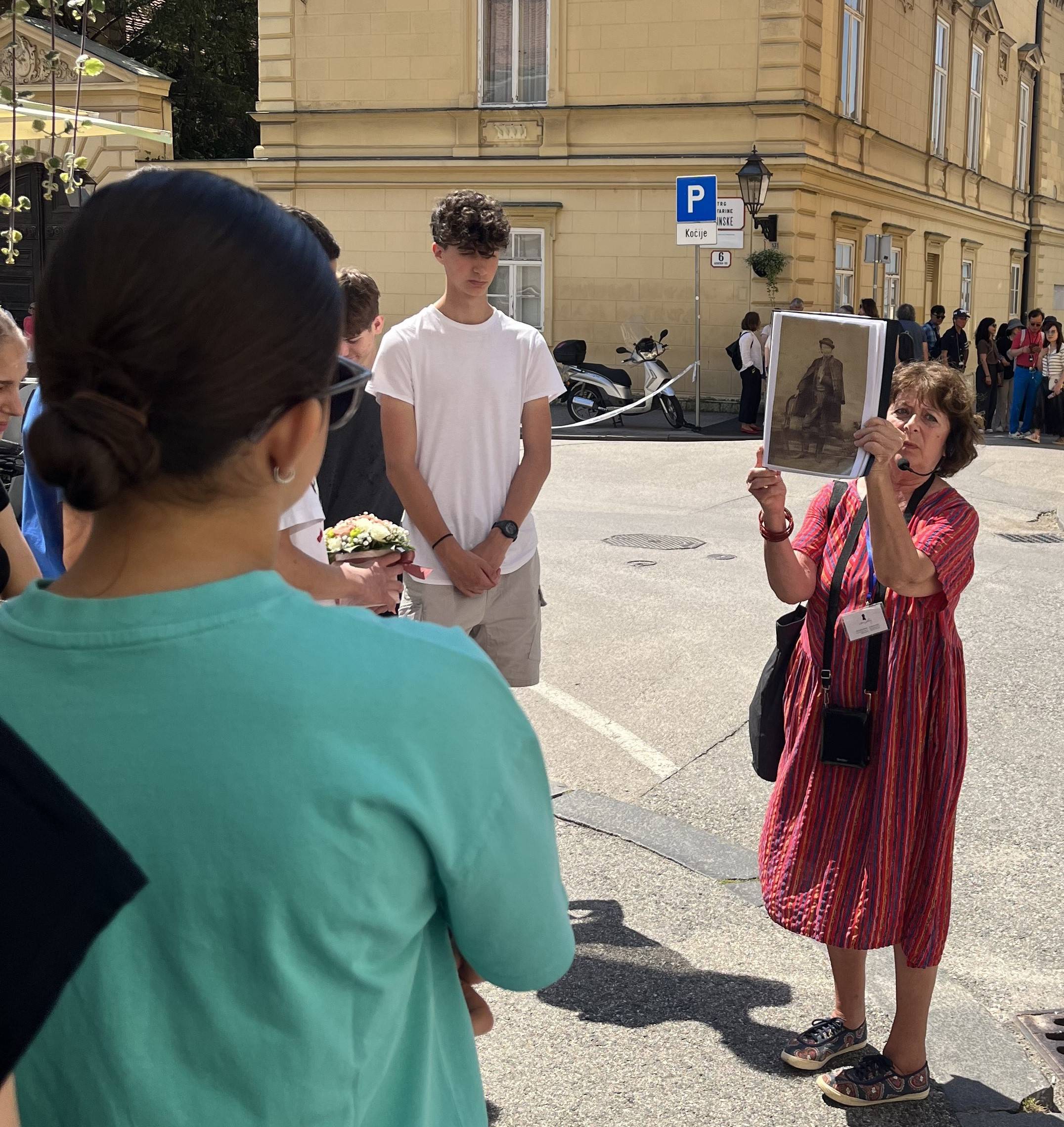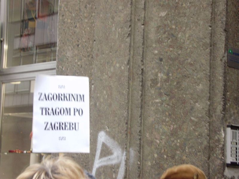 Šetnju je vodila profesorica Slavica Jakobović-Fribec, autorica "Vodiča Zagorkinim tragom kroz Zagreb". Upravo na inicijativu gospođe Jakobović-Fribec pokrenuti su 2007. godine Dani Marije Jurić Zagorke. Voditeljica nam je pričala o životu i djelu naše književnice, zaustavljajući se kraj lokacija i ustanova koje svjedoče o Zagorkinoj intimnoj, književnoj i novinarskoj borbi: Jelačićev trg, Markov trg, Varšavska ulica, Frankopanska ulica, Mažuranićev trg, hotel Esplanade, Petrinjska ulica, hotel Palace, Dolac, Tkalčićeva ulica...