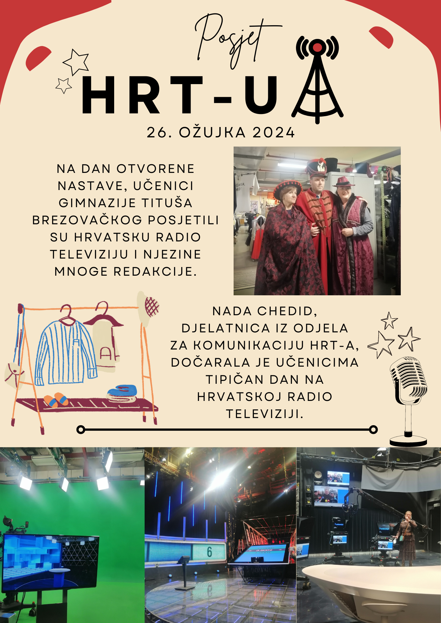 Dobili smo priliku ući u režiju Radio-Sljemena gdje smo uživo pratili intervju članova Prljavoga kazališta koji je vodio Zlatko Turkalj. Posjetili smo i dva studija iz kojih se emitiraju Vijesti i Dnevnik te smo sjeli na mjesta voditelja i fotografirali se. Ušli smo i u novinarsku redakciju u kojoj smo mogli postaviti pitanja lektorici i novinarima HRT-a Denisu Latinu, Damiru Smrtiću, Šimi Vičeviću… U tišini smo nazočili i snimanju HRT-ove dječje emisije „Juhuhu“ te prošetali pozornicom i backstageom odakle se trenutno emitira emisija „Zvijezde pjevaju“, a inače i „The Voice“, „Super potjera“ te slične emisije HRT-ova zabavnoga programa. Posjetili smo i studio namijenjen snimanju radijskih drama te jednu od samo dviju „gluhih“ soba u Hrvatskoj.