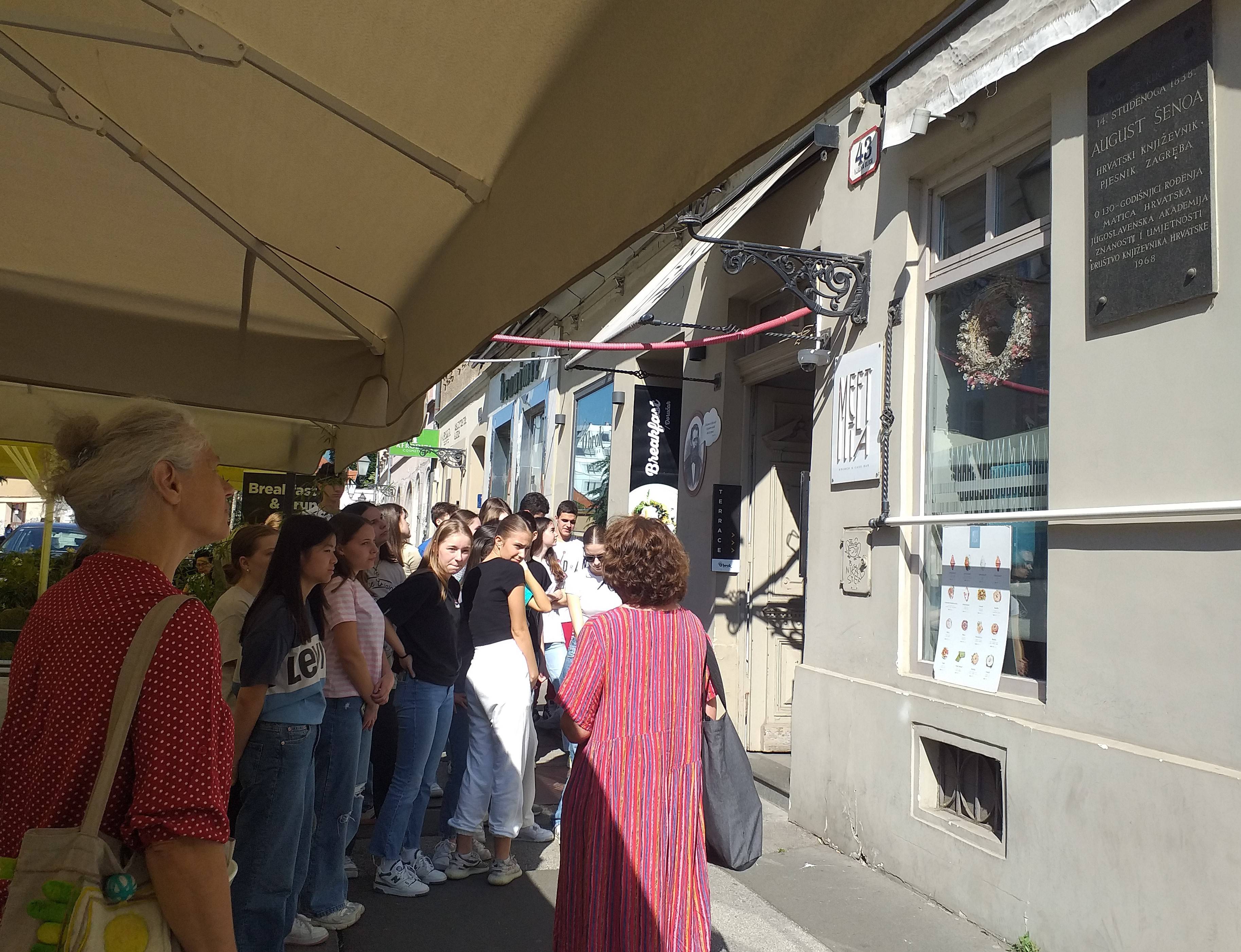 Sastali smo se kod Šenoina spomenika i krenuli prema rodnoj kući poznatoga književnika. Put nas je vodio od stare Vlaške preko Europskoga trga pa sve do Manduševca, Harmice, preko Krvavoga mosta kroz Radićevu, a onda do Kamenitih vrata i Dore Krupićeve te do zgrade naše gimnazije. Šetnju smo priveli kraju u Ćirilometodskoj ulici.