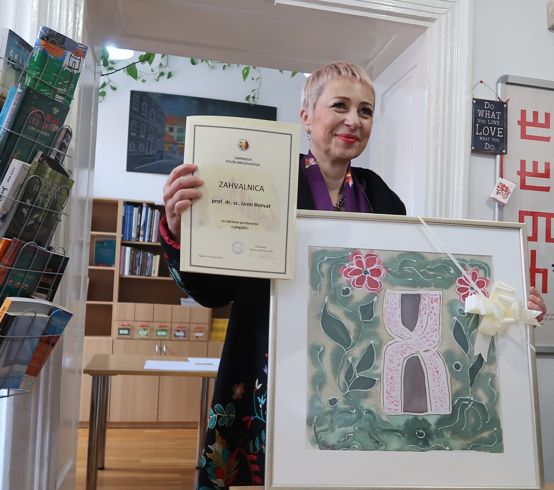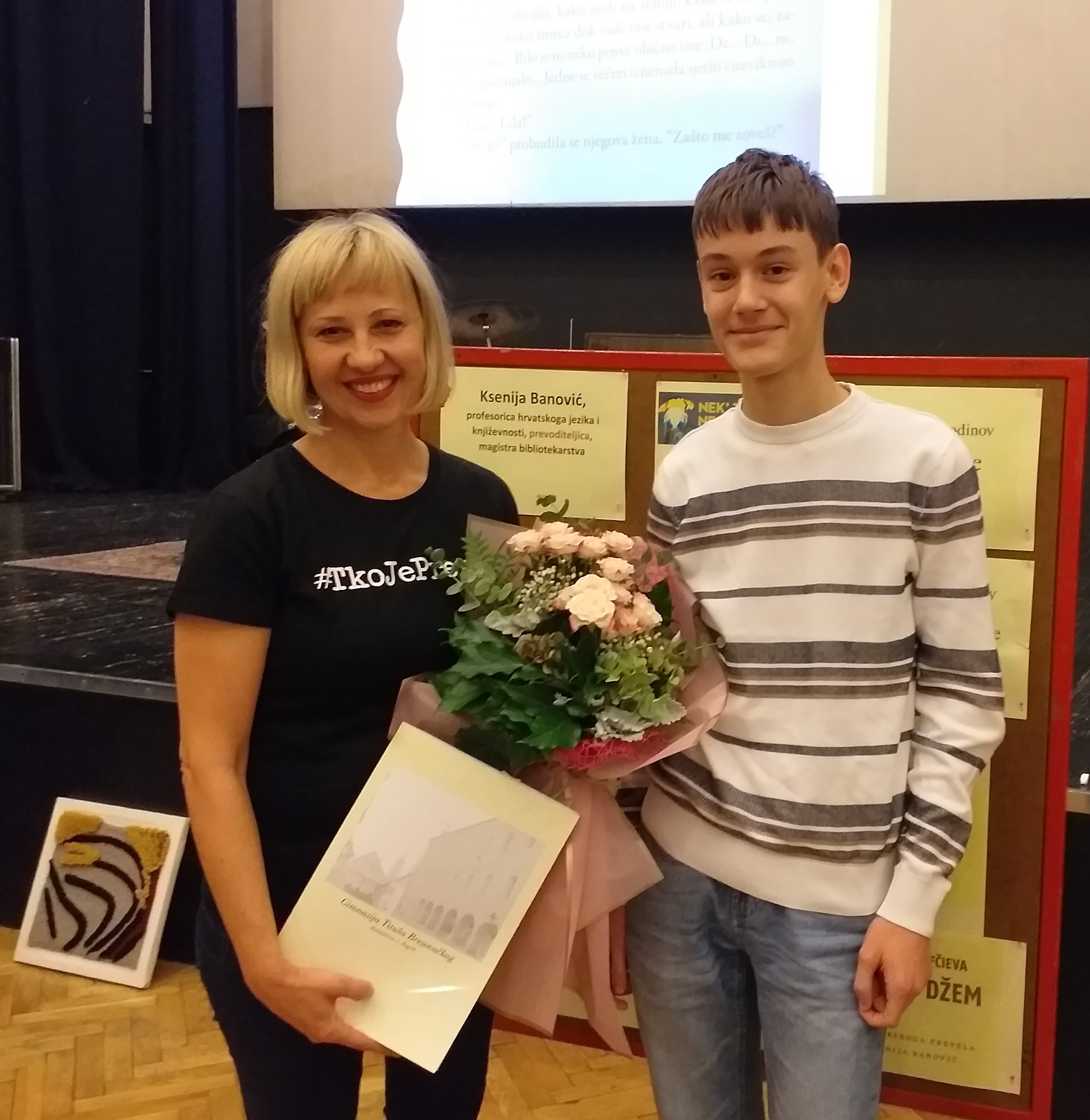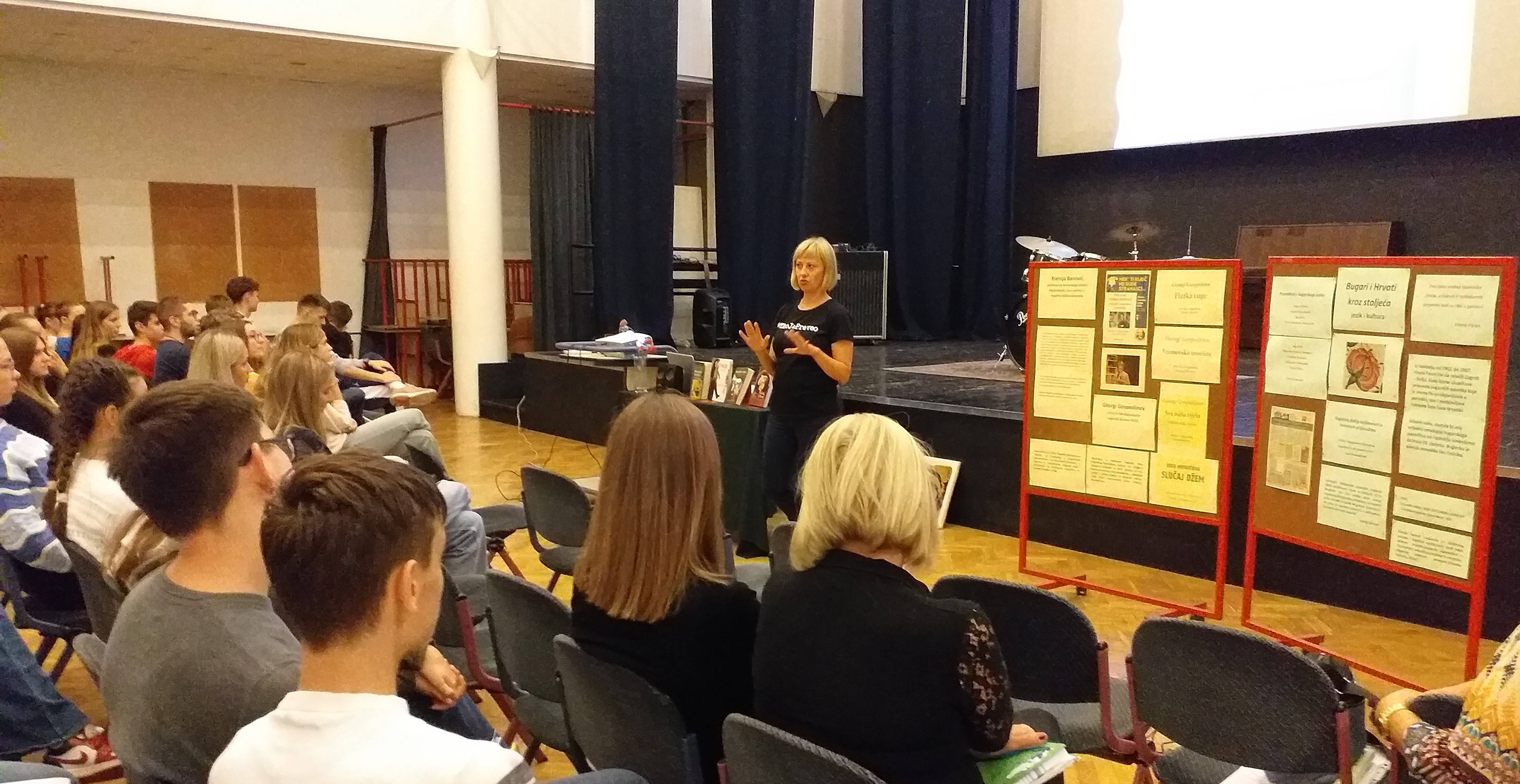 Povodom Mjeseca hrvatske knjige Ksenija Banović, profesorica hrvatskoga jezika i književnosti, vrsna prevoditeljica i magistra bibliotekarstva, održala je učenicima i profesorima naše gimnazije predavanje Umijeće i umjetnost prevođenja.