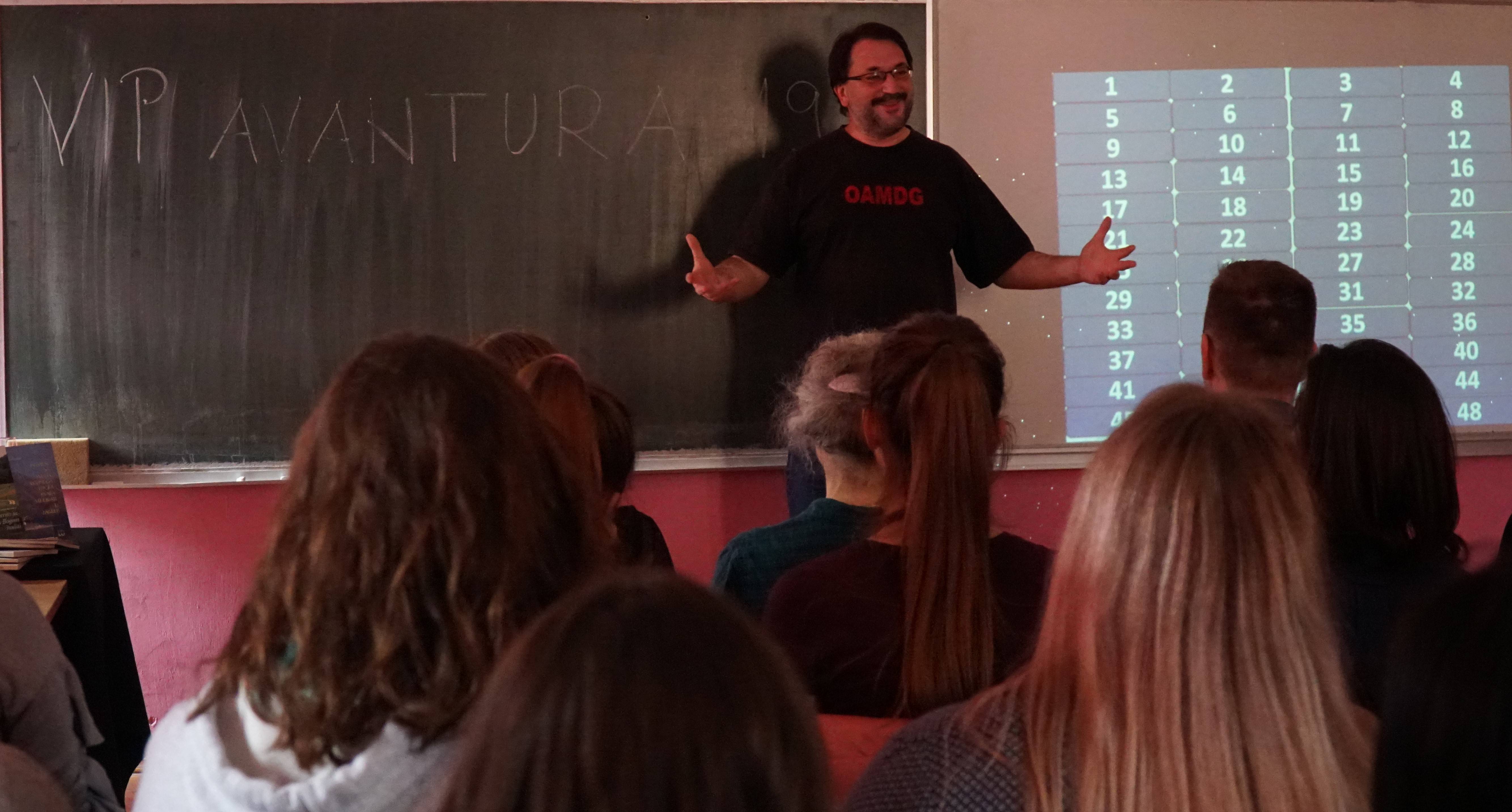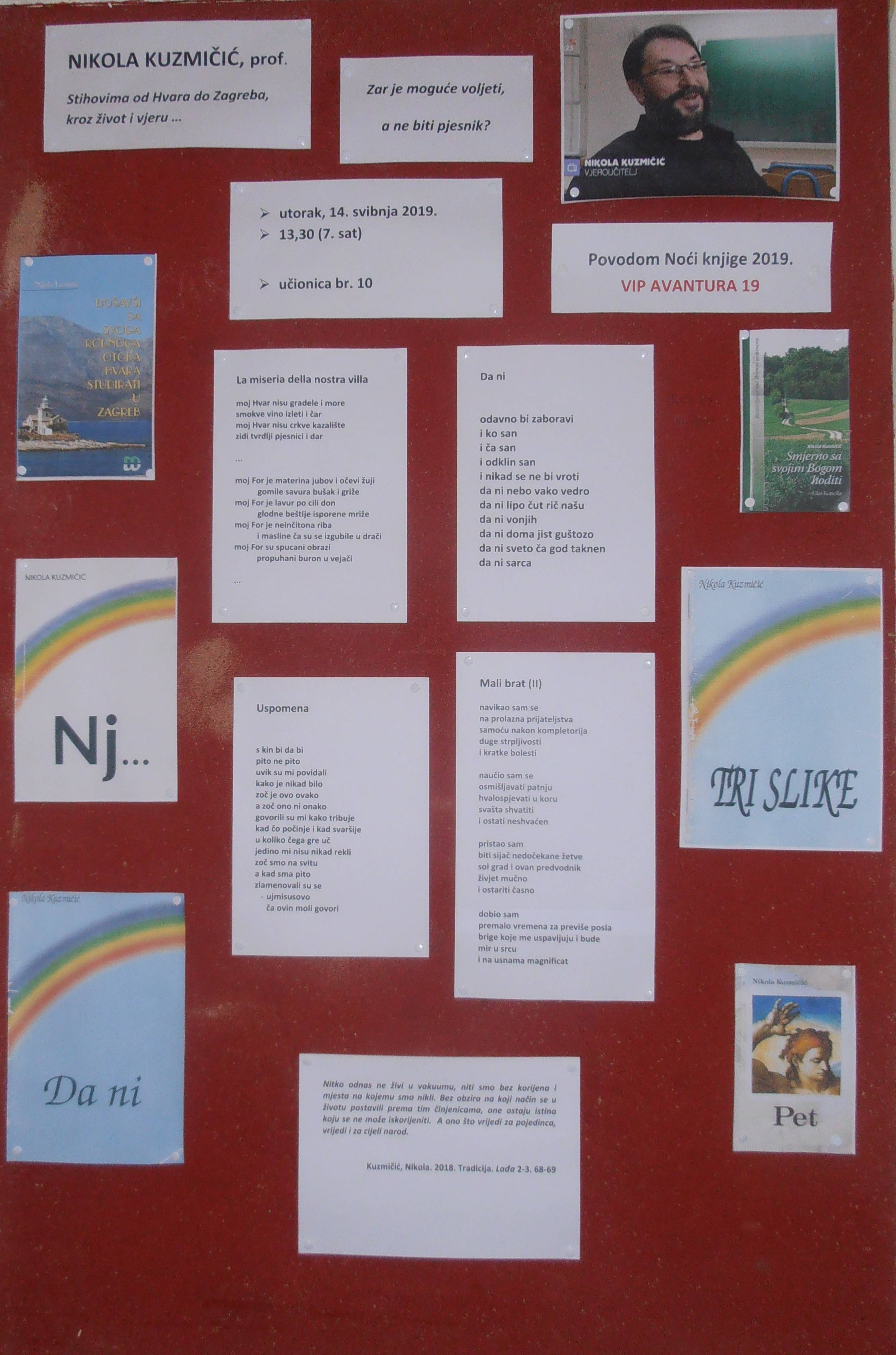 Sve nas je na matineji Noći knjige u Gimnaziji Tituša Brezovačkog okupio profesor Nikola Kuzmičić. Bili smo njegovi VIP gosti na pjesničkom susretu pod nazivom VIP avantura. I zaista, svjedočili smo svečanoj atmosferi u kojoj se uživalo u svakoj izgovorenoj riječi, šali, proživljenoj istini i mudrosti profesora Kuzmičića. Nije nam nedostajalo duha, ni smijeha, ni dobroga raspoloženja.
