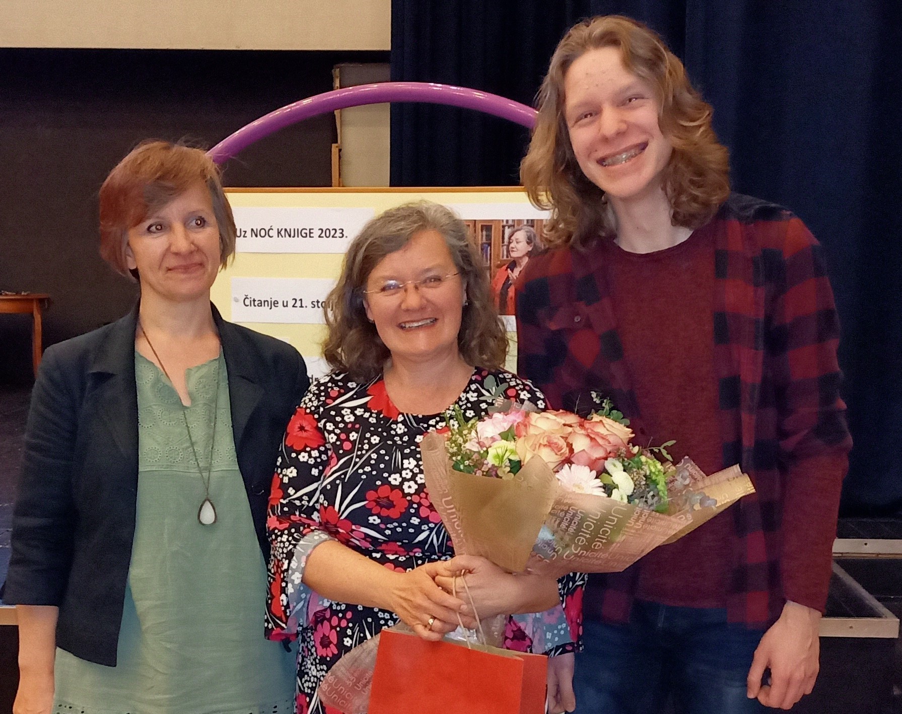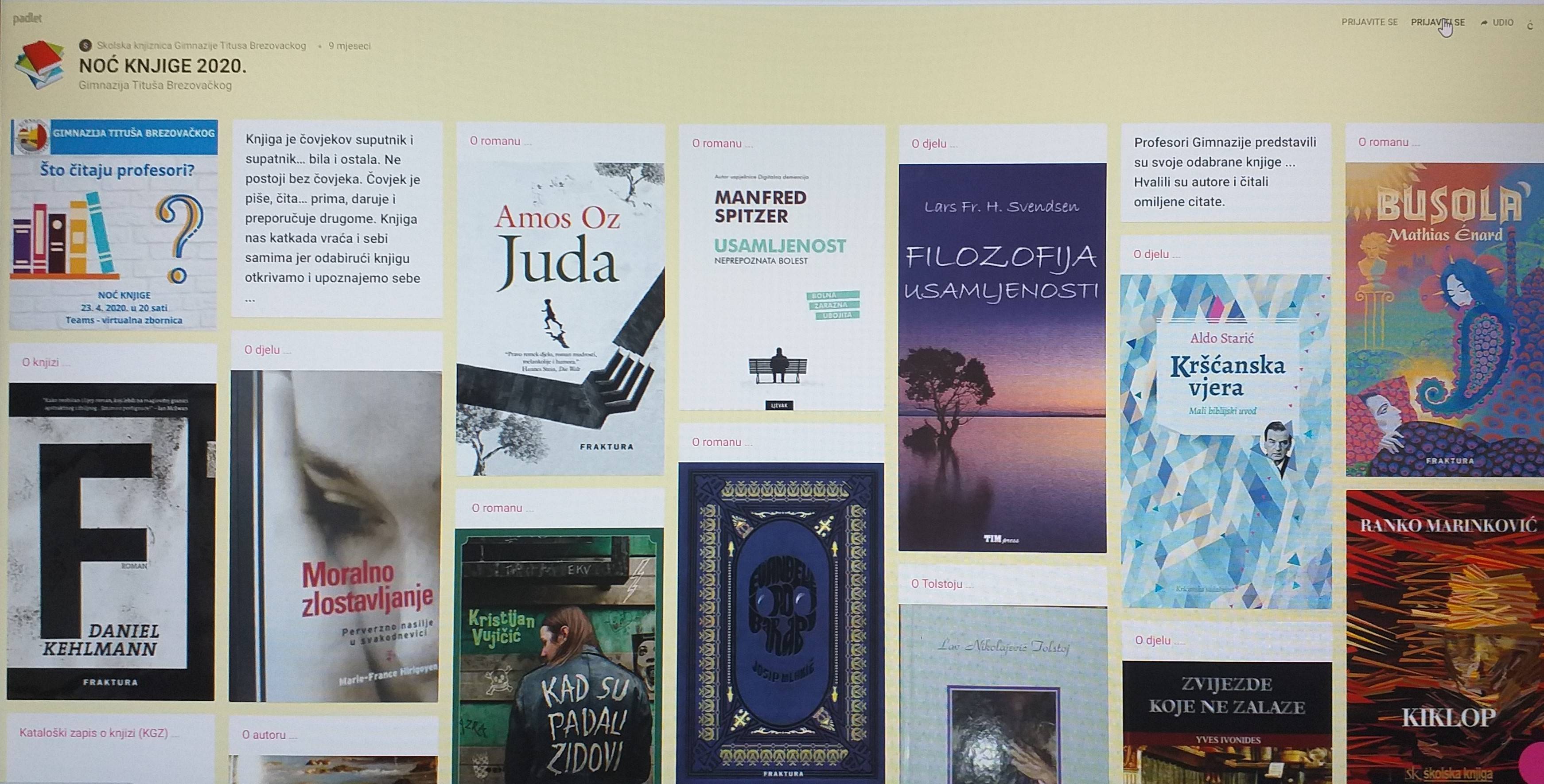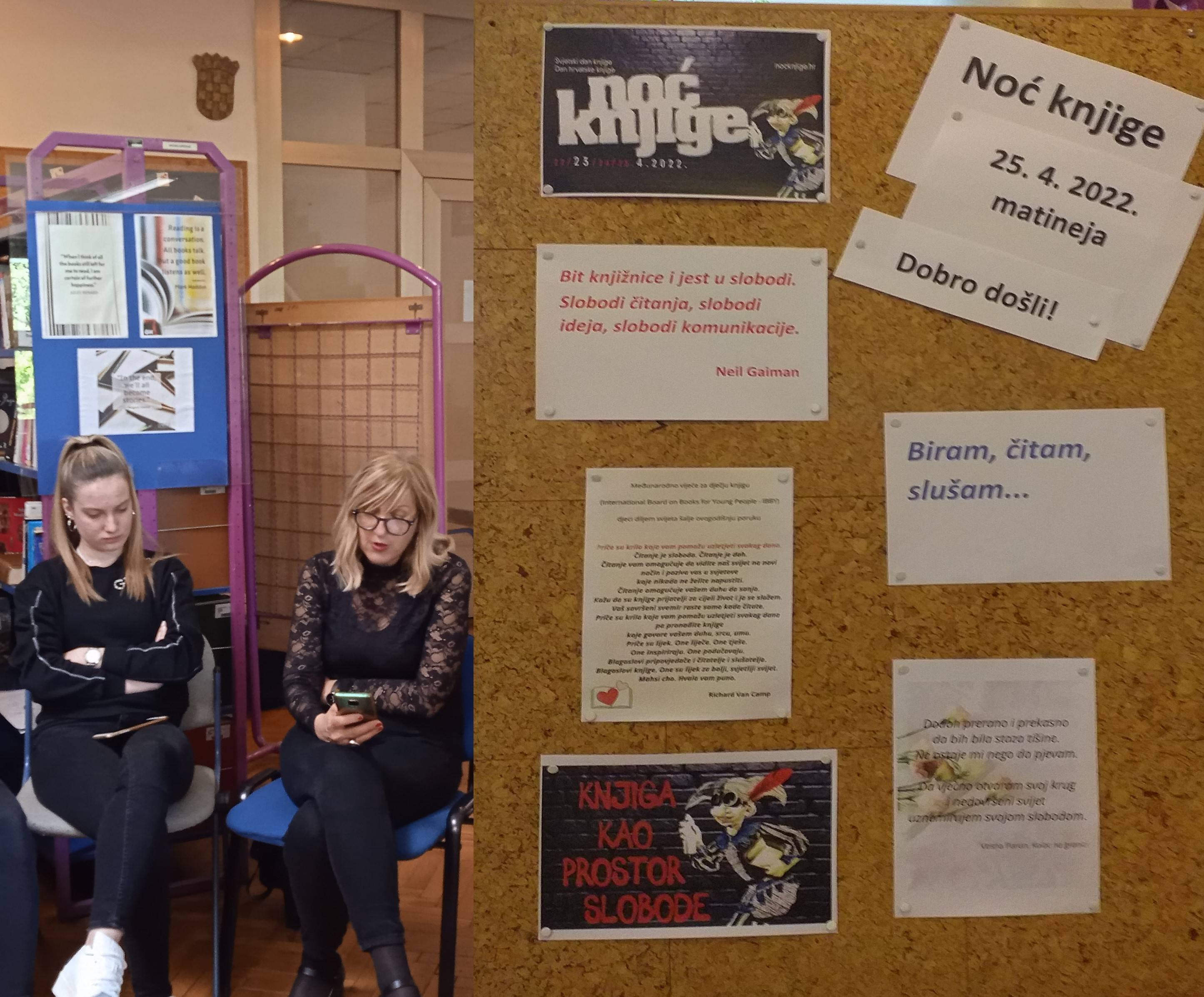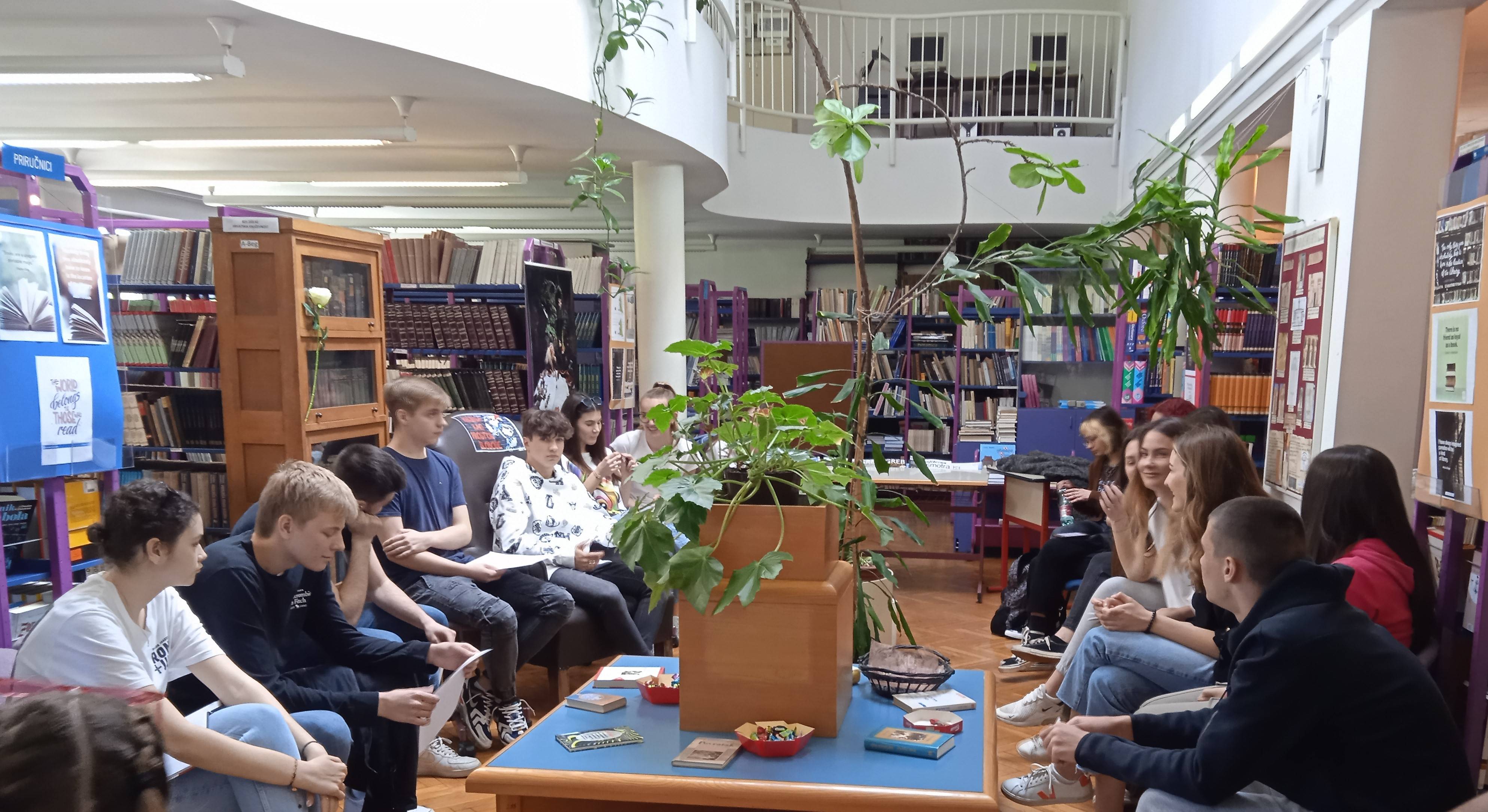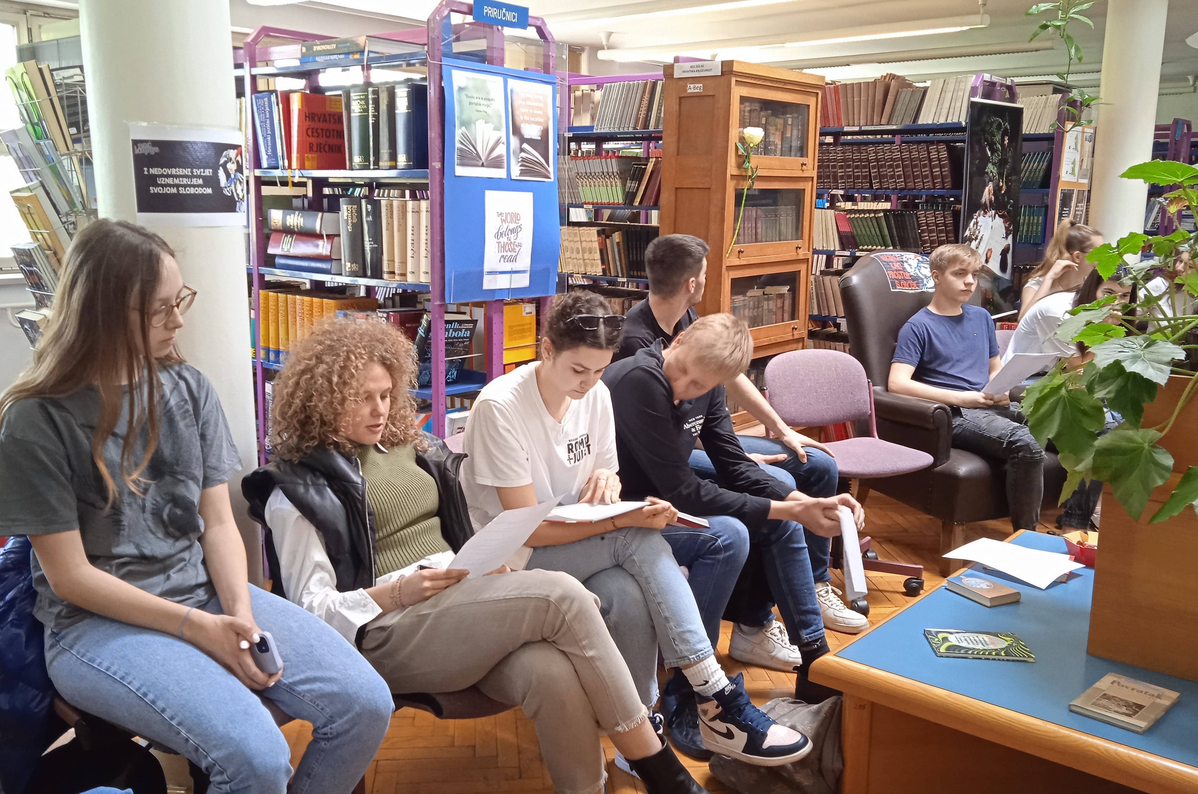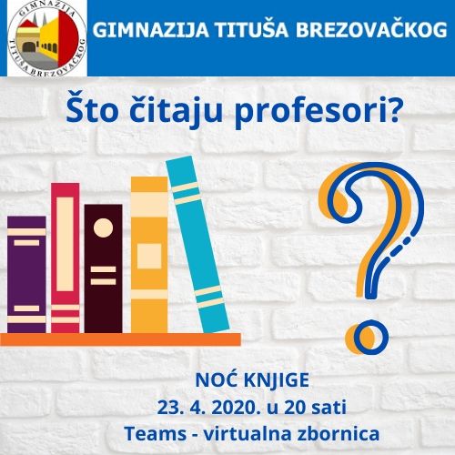 Ove godine naša Gimnazija uključila se u službeni program manifestacije Noć knjige. U četvrtak, 23. travnja u 13,30 okupilo se zainteresirano društvo ljubitelja knjige i pjesničke riječi. Bilo je tu učenika, profesora, prijatelja, roditelja, dragih gostiju iz susjedne VI. gimnazije (profesorica Dunja Malnar i učenici) i i Knjižnice Marije Jurić Zagorke...