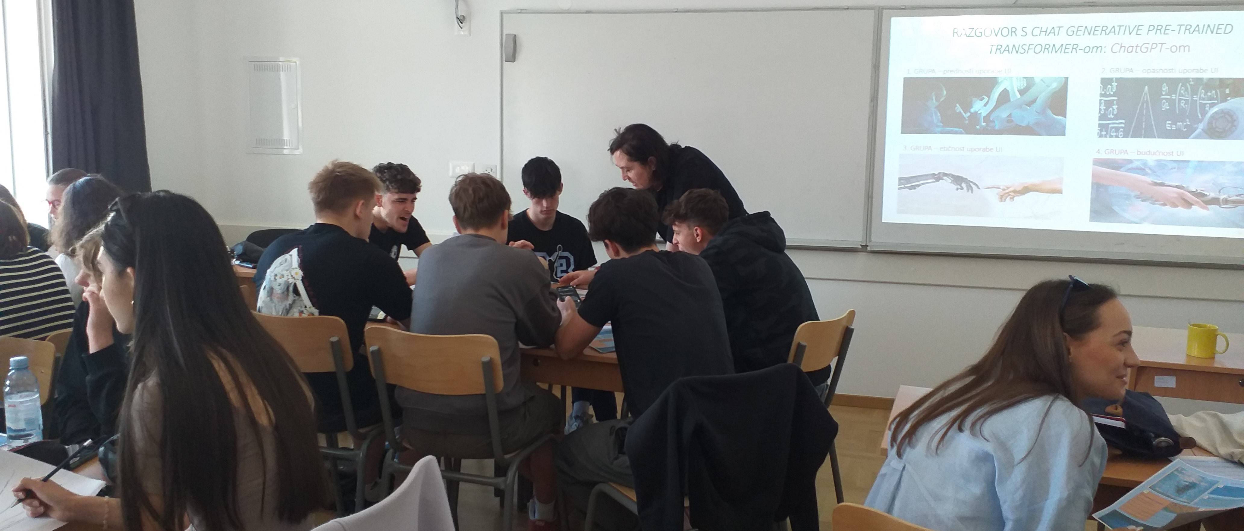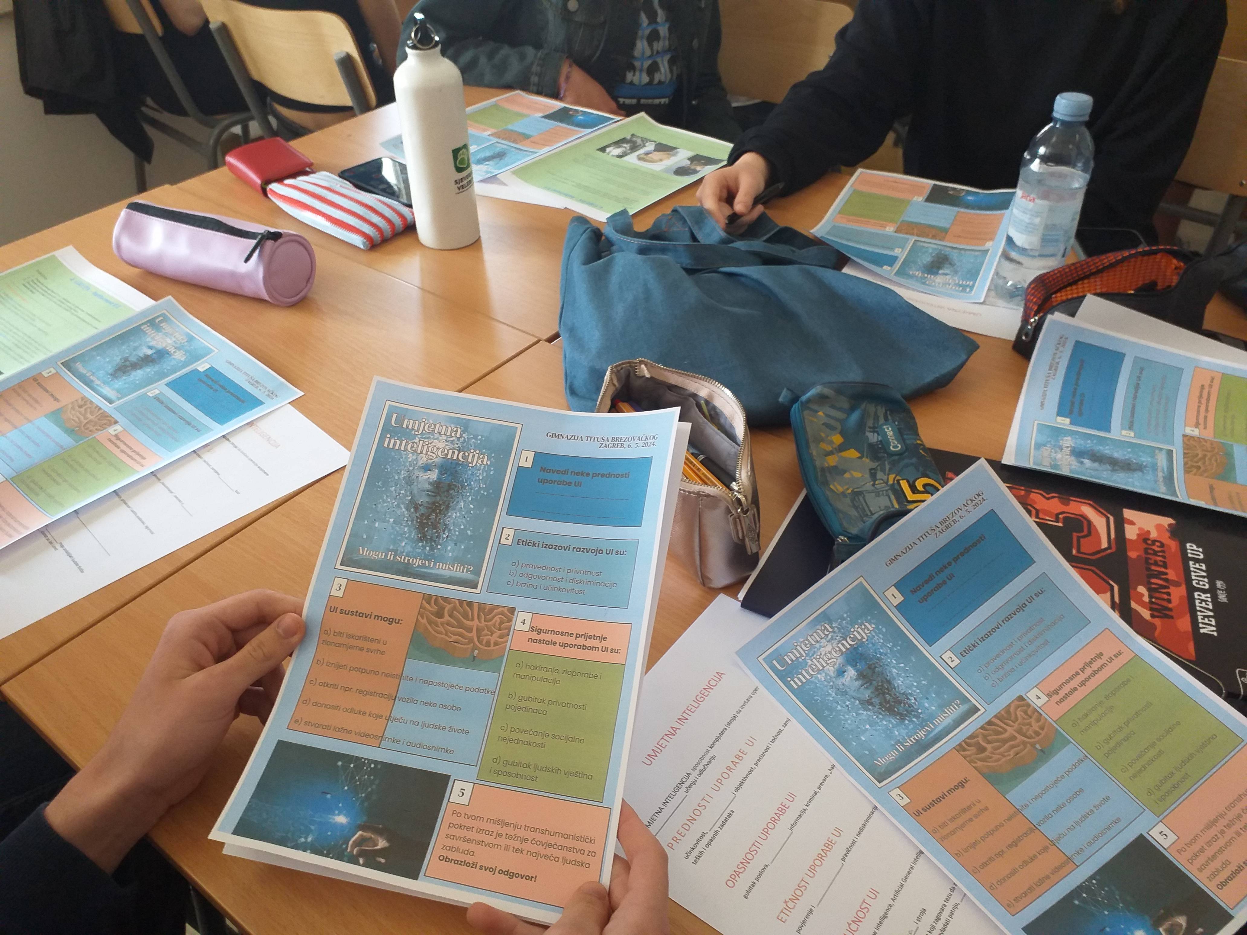 Na radionici su učenici u skupinama, koristeći alat Chat GPT, rješavali zadatke vezano za umjetnu inteligenciju: prednosti uporabe, opasnosti uporabe, etičke izazove razvoja te njezinu budućnost.