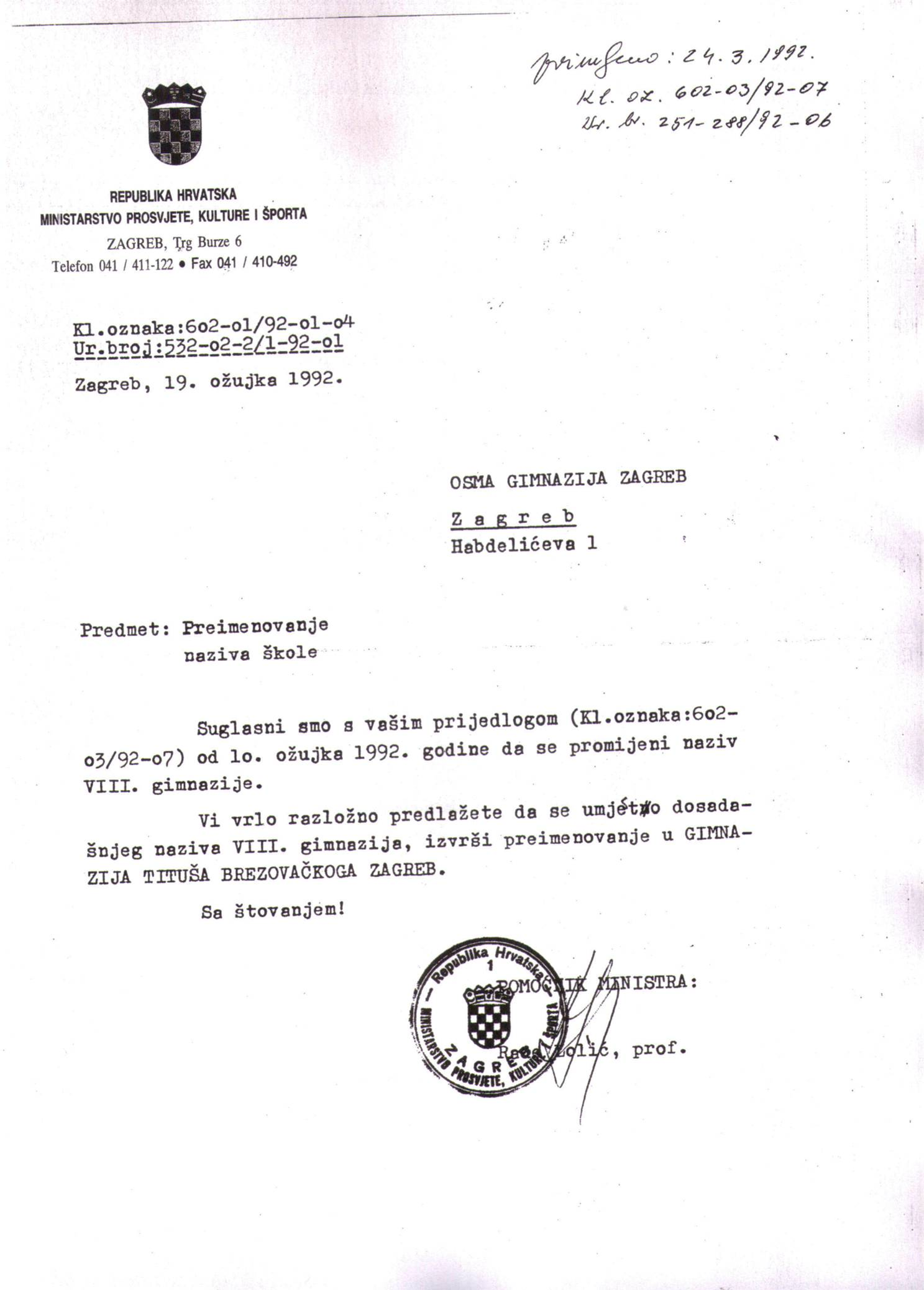 Akt o osnivanju Gimnazije Tituša Brezovačkog
