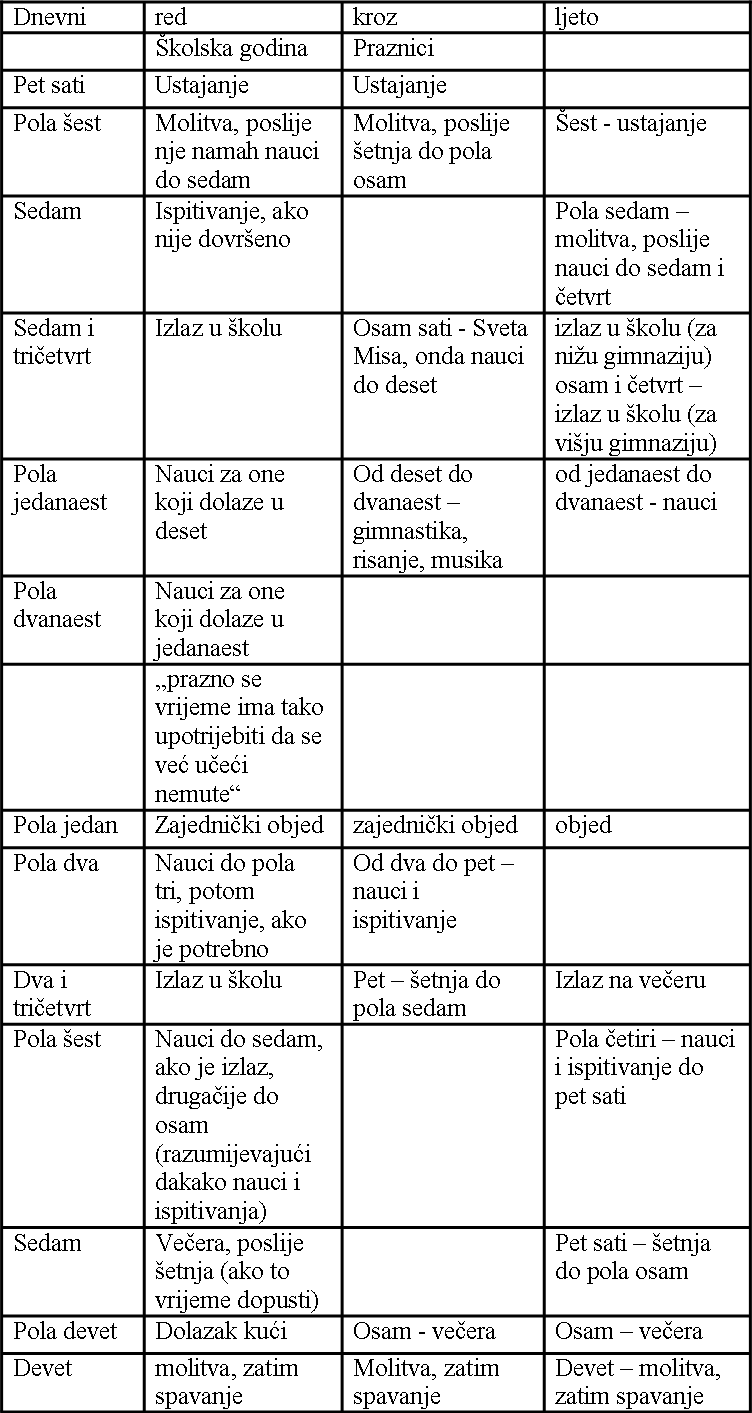 Navečer smo imali vrijeme predviđeno za učenje i korepeticije, u pola 9 smo već morali ići na spavanje, a svjetla su se gasila u 9. Nedjeljom i blagdanom nismo naravno išli u školu, ali smo zato išli u crkvu. Uz učenje imali smo i vrijeme predviđeno za šetnju.“
