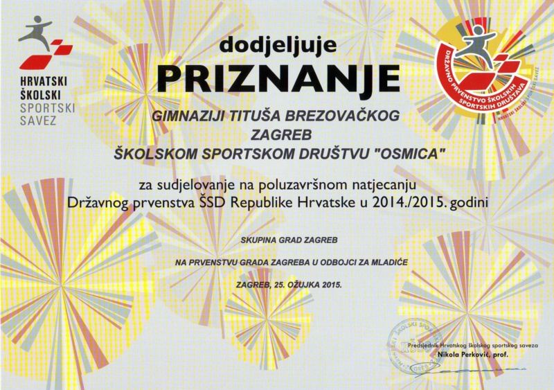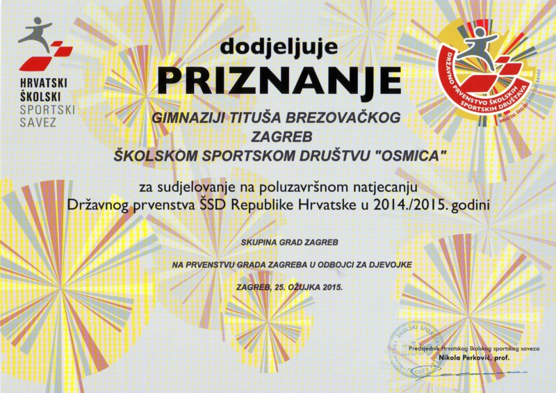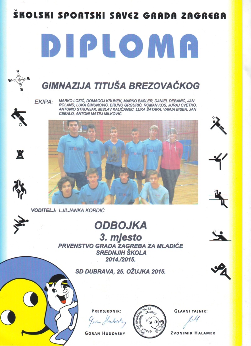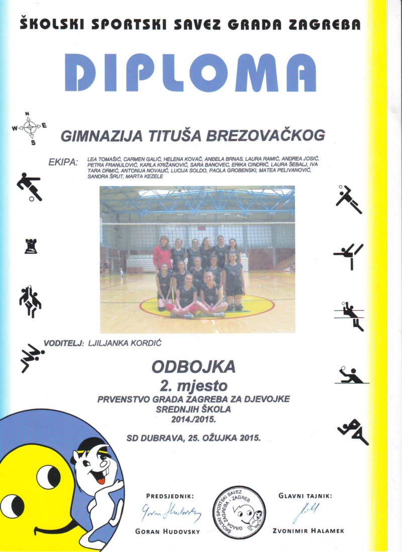 Ženska odbojkaška ekipa Gimnazije Tituša Brezovačkog u sastavu: Lea Tomašić, Carmen Galić, Helena Kovač, Anđela Brnas, Laura Ramić, Andrea Josić, Petra Franulović, Karla Križanović, Sara Banovec, Erika Cindrić, Laura Šebalj, Iva Tara Drmić, Antonija Novalić, Lucija Soldo, Paola Grobenski, Matea Pelivanović, Sandra Šrut i Marta Kezele osvojila je drugo mjesto u Zagrebu na utakmici koja je odigrana 25. ožujka.