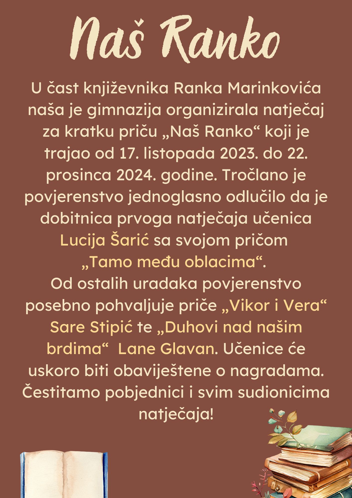 U petak 7. ožujka 2025. s početkom u 12 sati održana je regionalna razina kviza znanja i kreativnosti „Mreža čitanja” za srednje škole u školskoj godini 2024./2025. Kvizu znanja u našoj školi pristupilo je sedmero učenika, od kojih je na nacionalnu razinu prošlo njih šestero: Mihaela Orlić (1.e), Nina Videka (2.c), Lara Harašić (2.a), Lucija Nazlić (3.a), Sara Stipić (3.c) i Lana Glavan (3.e). Svim učenicima se zahvaljujemo na sudjelovanju i želimo im sreću u nastavku natjecanja.