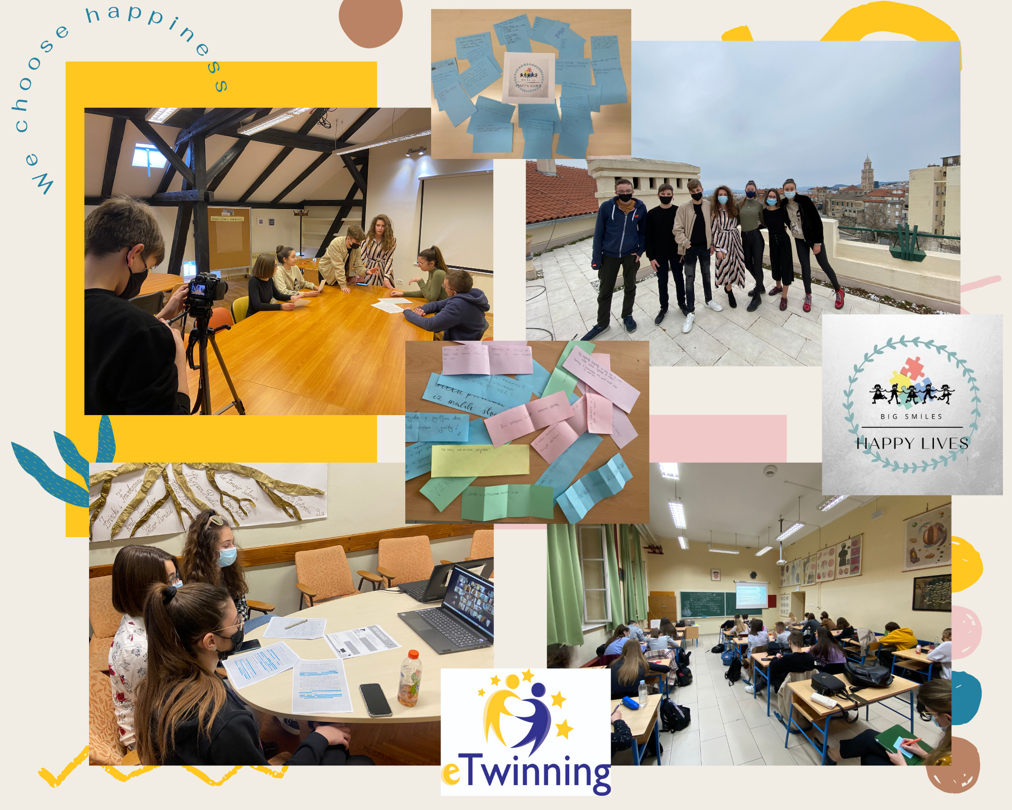 „We choose happiness“ je kratki eTwinning projekt kojim se obilježio Međunarodni dan sreće (20. 3. 2021.). U ovom projektu sudjelovali su učenici 1.D razreda: Luka Bajto, Roko Butorac, Nina Kotarac, Lucija Lučin, Ana Mateljan, Petra Vrca i Ivan Žagrović. Voditeljica projekta je bila pedagoginja pripravnica Lucija Bižaca u suradnji s njihovom razrednicom Josipom Terezijom Mikulić te ostalim nastavnicima. Učenici su provodili različite aktivnosti u školi, ali i online. Na papiriće su pisali sve što za njih simbolizira sreću u svakodnevnom životu, dijelili su ideje sa svojim kolegama u razredu, ali i virtualno putem digitalnih alata. Čitali su brošuru o mentalnom zdravlju i sreći te su istu komentirali i prezentirali preko Zoom sastanka s učenicima iz drugih dijelova Europe. Osim toga, učenici su birali svoje najdraže pjesme ili citate iz knjiga te ih čitali na online javnom događaju. Uz to, osmislili su poruke sreće koje su podijelili sa svojim dragim prijateljima, obitelji i nastavnicima. Najdraža aktivnost koju su ponosno i entuzijastično proveli bilo je snimanje i prezentiranje vlastite škole kroz jedan video koji ćemo objaviti i na našoj stranici. Ovim su se projektom, osim poticanja i prepoznavanja sreće, naši učenici međusobno još više zbližili i povezali, ali i proširili svoja poznanstva s učenicima diljem Europe. Na kraju su vedra i nasmijana lica poželjeli svima: „Mi biramo sreću!“.