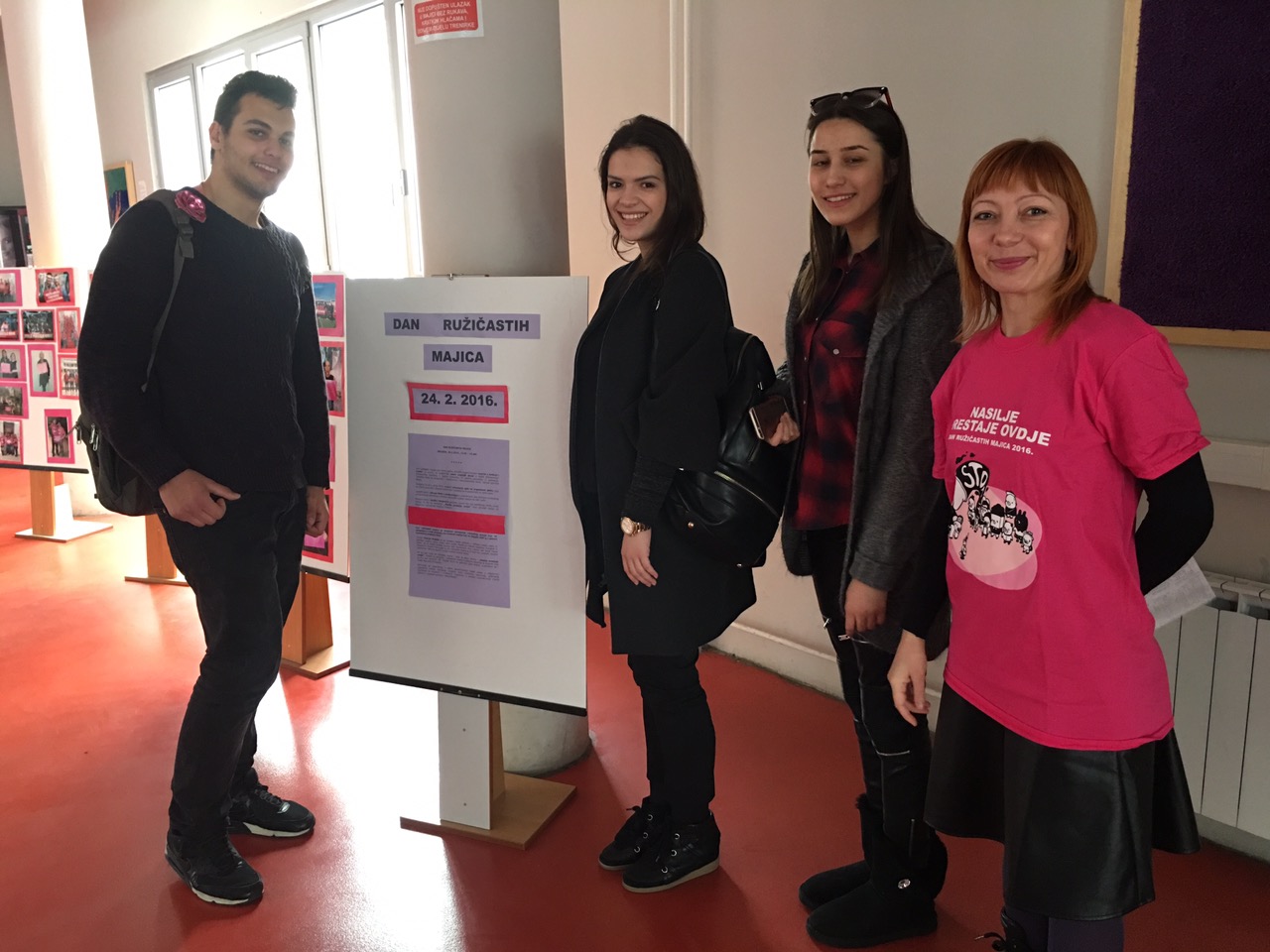 U srijedu, 24. veljače 2016. obilježavao se Dan ružičastih majica, dan u kojem mladi i društvo dižu svoj glas protiv vršnjačkog nasilja. Rado smo se udružili s kolegama iz Obrtno-tehničke škole koji su organizirali prigodnu izložbu, predavanje o volonterstvu te turnir u tradicionalnim kartaškim igrama briškuli i trešeti na koji su se naši učenici osobito rado odazvali. Psihologinja: Željka Friganović Jerončić, prof.
