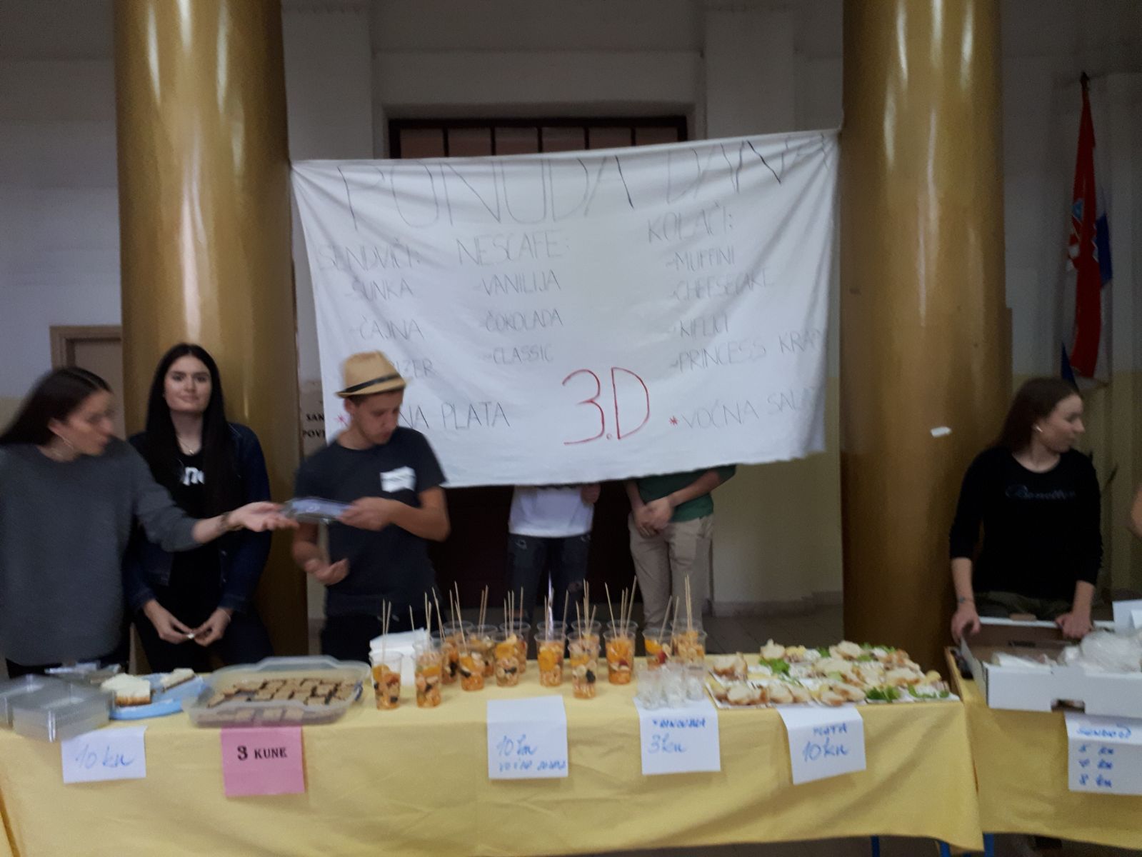 Svaki dan, za vrijeme velikog odmora, jedan je razred imao prodajno mjesto na kojem je svojim vršnjacima, profesorima, a i roditeljima koji su, zapravo došli na primanja, nudio, ovisno o maštovitosti i mogućnostima, domaće kolače i torte, razne vrste sendviča, sokove, voće i voćne salate, ćevape u lepinji, soparnik, smoothie, …