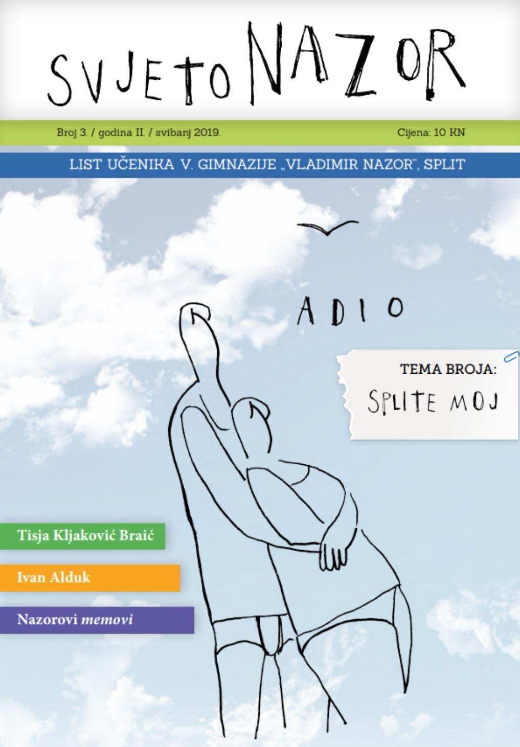 Dragi nazorovci, bivši, sadašnji i budući! Obavještavamo vas da je stigao i 3. broj SvjetoNAZORA! Cijelu smo se godinu trudili istraživati svima nama zanimljive teme, izvijestiti o vašim uspjesima, popratiti školska i izvanškolska događanja, modu i trendove. Potražite naše učenike-novinare za vrijeme malih i velikih odmora u školskom atriju i ispred zbornice i nabavite vlastiti primjerak lista po simboličnoj cijeni od 10 kuna. Ne stignete li na vrijeme, list možete kupiti i u školskoj referadi. Do čitanja sljedeće godine! Uredništvo