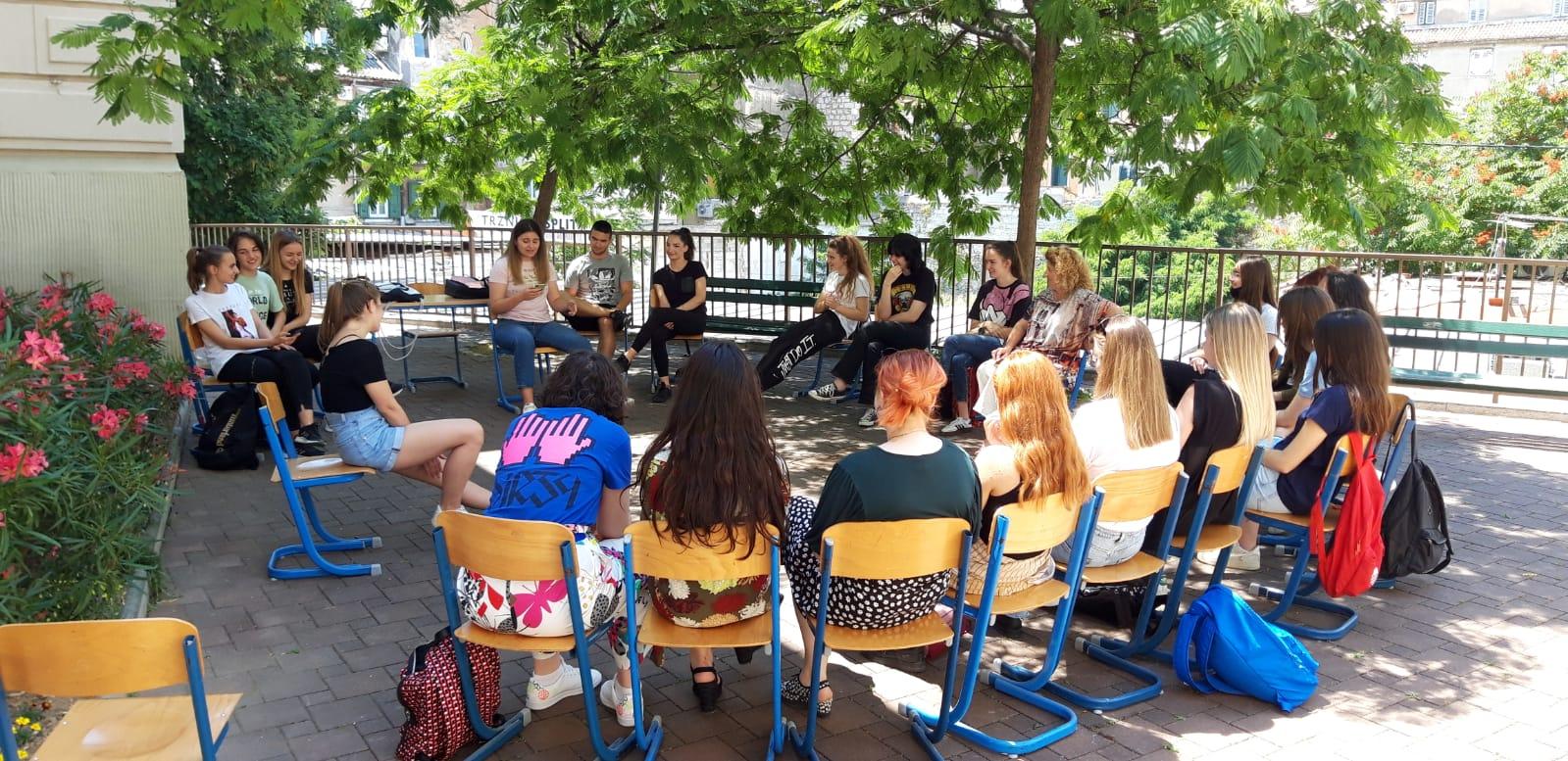 U dvorištu kraj sporednoga ulaza u našu gimnaziju mi smo "izbornjaci" zajedno sa svojom profesoricom Ljiljanom Mlačić-Brakus uživali u radionici koju je glumica za nas pripremila.