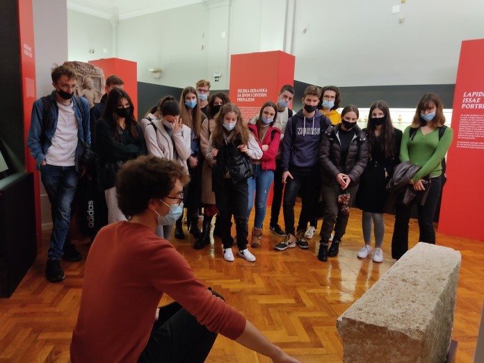 U četvrtak smo (učenici 2.e , 2.c i 2.d razreda) u sklopu dodatne nastave iz povijesti posjetili Arheološki muzej. S nama su išle profesorica povijesti Katarina Domljanović i profesorica latinskog jezika Sanja Deletis. Budući da smo već ranije posjetili laupidarij (prostor oko muzeja) i saznali mnogo zanimljivih činjenica, sada smo vidjeli izložbu u samoj zgradi muzeja. Tema je izložbe Issa (Vis) i imali smo priliku vidjeti mnoge spomenike i predmete koje su Isejci svakodnevno koristili. Kroz muzej su nas provela trojica vodiča koji su nam na zanimljiv način predstavili Issu i upoznali sa životom stanovnika najudaljenijeg naseljenog hrvatskog otoka.