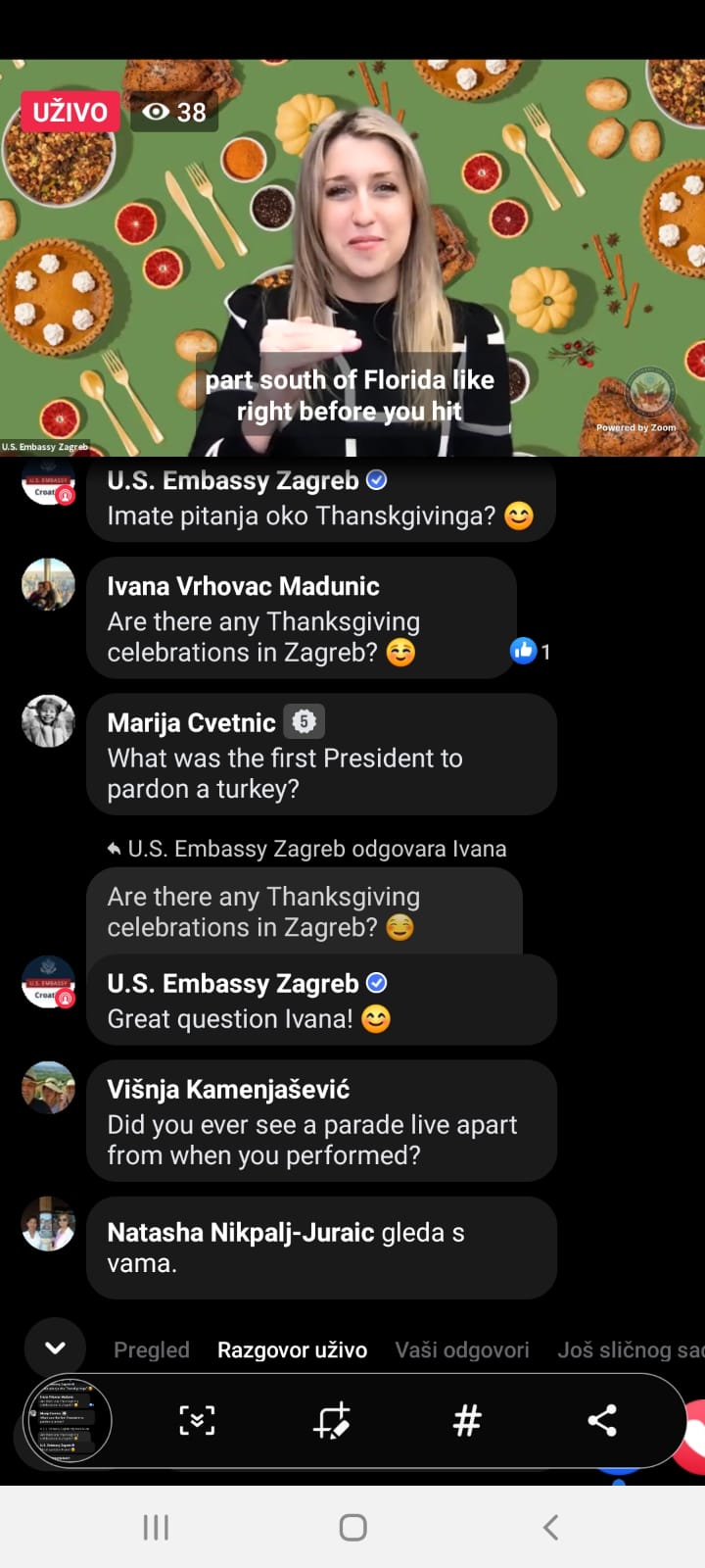 U susret Danu zahvalnosti, u ponedjeljak smo slušali izlaganje vicekonzulice Ashely Inamn putem aplikacije Facebook Live. Posebno nam se dopalo što smo čuli osobna iskustva proslave ovog blagdana i to od strane rođene Amerikanke. Saznali smo i neke nama dosada nepoznate zanimljivosti a učenici su imali i nekoliko zanimljivih pitanja. Hvala American Corner Zagreb i U.S. Embassy Zagreb na pozivu i organizaciji događaja!