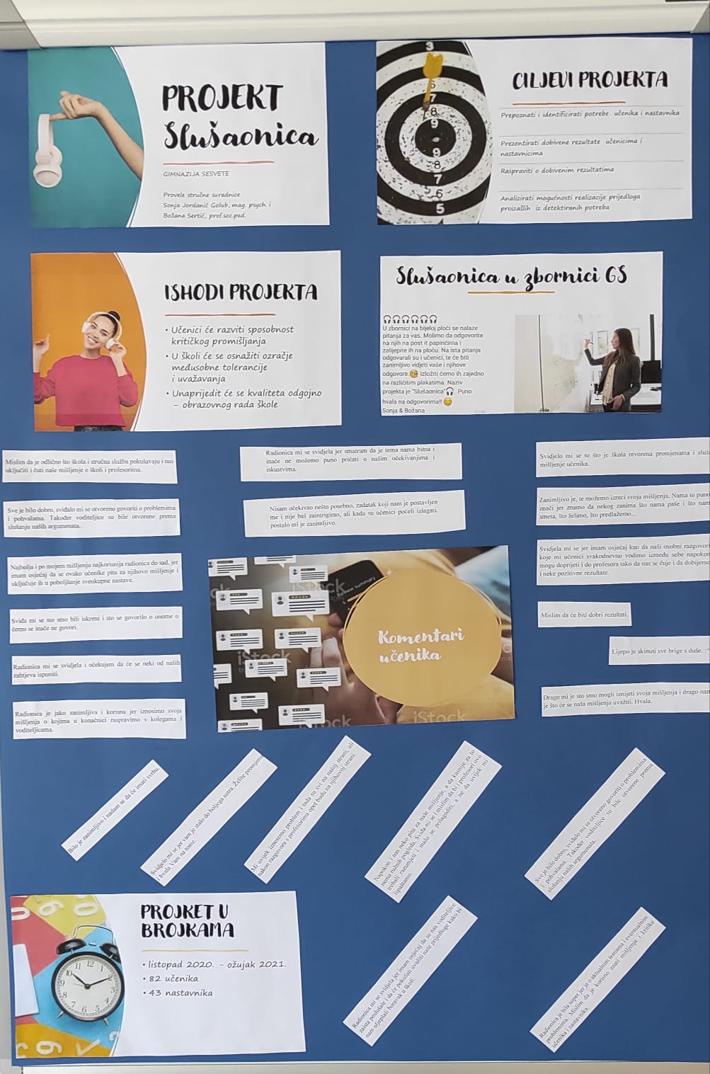Projekt Slušaonica započeo je u listopadu 2020.g. Ciljevi projekta su: prepoznati i identificirati potrebe učenika i nastavnika, prezentirati dobivene rezultate učenicima i nastavnicima, raspraviti o dobivenim rezultatima i analizirati mogućnosti realizacije prijedloga proizašlih iz detektiranih potreba.