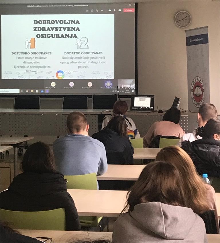 Također smo u drugom dijelu predavanja slušali o važnosti osiguranja kao instrumenta očuvanja osobne i društvene stabilnosti. Upoznali smo razne vrste osiguranja: životno, zdravstveno, kolektivno osiguranje, osiguranje imovine i sl. Malo nas je iznenadio podatak da smo po osiguranju imovine pri samom dnu od svih europskih zemalja, a npr. drugi po konzumaciji alkohola. Naravno da smo imali i pitanja o ovoj zanimljivoj temi, koja zbog nedostatka vremena nismo mogli postaviti, ali ih učenici mogu uputiti na email naših predavača. Svi učenici 3.c razreda koji su sudjelovali na ovom predavanju na poklon su dobili priručnik o financijskoj pismenosti.