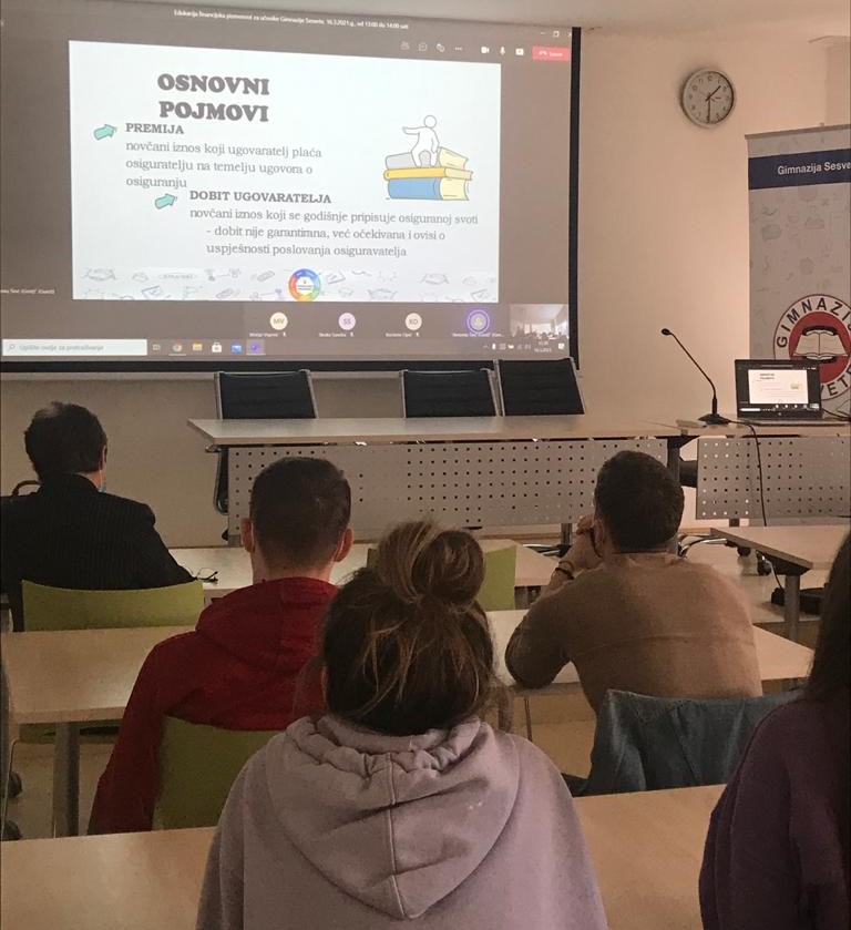 Predavanja o financijskoj pismenosti u Gimnaziji Sesvete zadnjih su godina organizirale profesorica Ljiljana Dujmović i knjižničarka Ruža Jozić, najčešće uz Svjetski dan štednje (30. listopada). Ove smo školske godine zbog epidemioloških okolnosti pomaknuli termin za dugo polugodište, ali opet nismo mogli imati radionice uživo, nego su održana online predavanja 16. ožujka 2021. za naše učenike 3. razreda. Predavanje je dogovoreno u suradnji s gospodinom Krešimirom Opićem i Hrvatskom gospodarskom komorom, a predavači su bili uvaženi stručnjaci: Sandra Skoko iz Hrvatske poštanske banke i Antoni Širić iz GRAWE osiguranja.