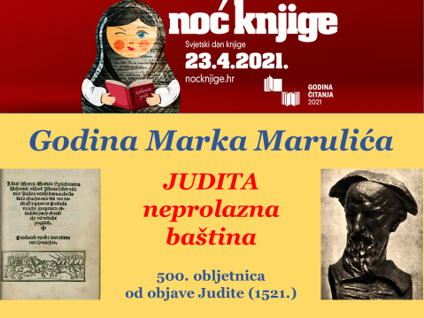 Odlukom Hrvatskoga sabora od 9. travnja 2021. proglašena je Godina Marka Marulića, koja će se obilježavati od 22. travnja ove do 22. travnja 2022. godine. Na taj način i šira će javnost imati priliku osvijestiti da se ove godine obilježava 500 godina od tiskanja Marulićeve Judite (1521.), prve autorske knjige na hrvatskom jeziku, zbog koje je Marulić nazvan Ocem hrvatske književnosti. Judita je prvi umjetnički ep u hrvatskoj književnosti napisan 1501. godine na narodnom jeziku, a objavljen u Veneciji 1521. godine. Judita je Marulićeva veličanstvena zamisao, kao spjev u kojem će viziju slobode svoga naroda prikazati alegorijom podviga biblijske junakinje Judite. Zahvaljujući Juditi, Marulić je stekao počasni naziv „oca hrvatske književnosti“, iako znamo da on nije kronološki prvi hrvatski književnik. On je po mnogočemu bio iznimna pojava, jer je svojom Juditom potvrdio da je u hrvatskom jeziku bilo moguće na prijelazu iz 15. u 16. st. ostvariti umjetnički ep kao najcjenjeniju renesansnu književnu vrstu, sa svim bogatstvom našega narodnoga jezika. Svoju Juditu Marulić piše „u versih harvacki složena“, ne za učene ljude, nego za one „ki nisu naučni knjige latinske aliti dijačke“.