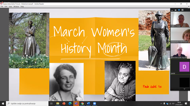 Nastavljamo suradnju s učenicima Gornjogradske gimnazije koji također pohađaju fakultativnu nastavu Američka kultura i civilizacija. Danas smo se našli kako bi nam predstavili svoj projekt "Inspiring Croatian and American women - Past and Present" kojeg su proveli u mjesecu ožujku povodom Međunarodnog dana žena. Naše učenice su također predstavile važne Afroamerikanke koje su istražile u veljači povodom Mjeseca afroameričke povijesti.