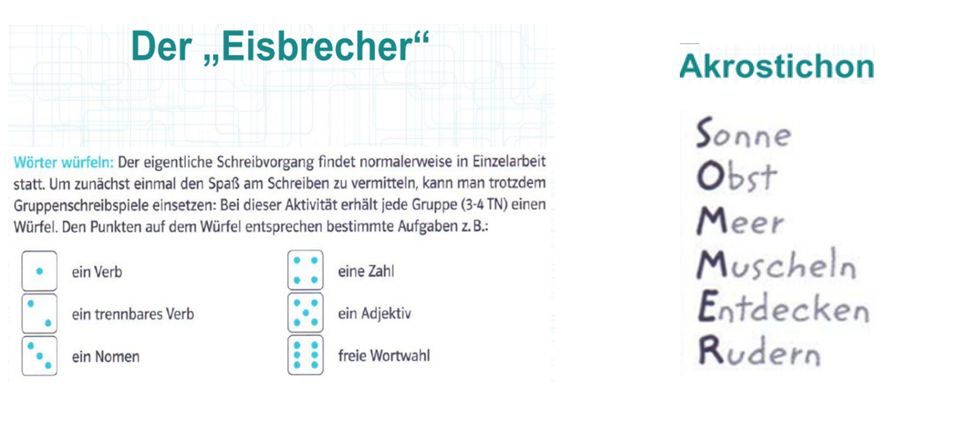 Za poticanje i razvijanje vještine pisanja istaknuta je osobito važnost pripremne faze, „faza prikupljanja“ materijala/„Sammelphase“, npr.: izrada asociograma ili clustering metoda, odgovori na W-pitanja, korištenje iskustva svih 5 osjetila, ali isto tako i primjena kreativnih igara kao što su Eisbrecher, Alltagsgegenstände mit Bedeutung, Gedichtformen - Akrostichon, ABC Gedicht oder Elfchen.