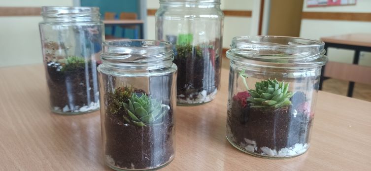 Za izradu vrta u boci koristili smo staklenke različitih dimenzija koje smo pronašli u kućanstvu. Na dno posude stavili smo sloj sitnih kamenčića, sloj zemlje i odabrane biljke. Zemlju smo lagano ovlažili prskalicom. Nakon sadnje posuda jedno vrijeme ostaje nepoklopljena, a nakon toga se stavlja čep ili poklopac i uživa u ovom kreativnom obliku vrtlarenja.