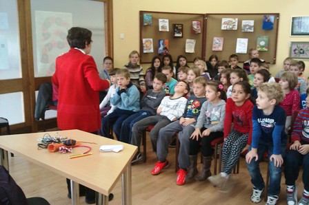 7.11.2013. s velikim veseljem ugostili smo u našoj školskoj knjižnici književnicu Željku Horvat Vukelja. Održala je dva književna susreta .Za učenike 1. razreda kao i uvijek spisateljica nam je u goste došla u pratnji svoje nadaleko poznate ljubičaste torbe zvane Violeta – to je torba s mnogo pretinaca u kojima se krije bezbroj iznenađenja i rekvizita od kojih svaki nosi svoju priču s poukom. U pripovijedanje priča spisateljica je uključila i učenike iz publike, koji su joj s velikim zadovoljstvom pomagali pri stvaranju raznoraznih zvukova.Iskustvo, entuzijazam i energija prštile su iz svake priče koju je književnica ispričala.