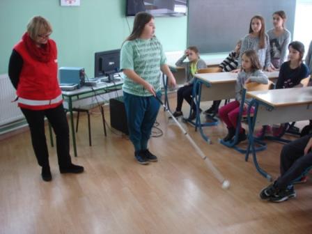 U utorak 20.10.2015. u okviru programa edukacije socijalne zajednice u suradnji s Gradskim društvom Crvenog križa Sisak, članovi Udruge slijepih SMŽ posjetili su Podmladak Crvenog križa naše škole. Kroz razgovor, demonstraciju i igru educirali su učenike o životu i potrebama slijepih i slabovidnih osoba, pomagalima s kojima se susreću, pravilnoj komunikaciji i vođenju slijepe osobe, ulozi psa vodiča u životu slijepe osobe. Učenici su aktivno sudjelovali i iznenadili zavidnim znanjem o sljepoći i slijepim osobama.