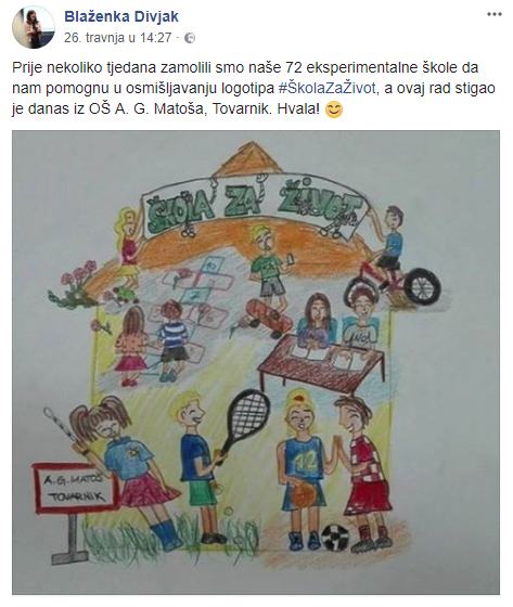 I naši učenici sudjeluju u osmišljavanju loga za eksperimentalni program "Škola za život" te je naše radove pohvalila ministrica Divjak na svojoj facebook stranici.