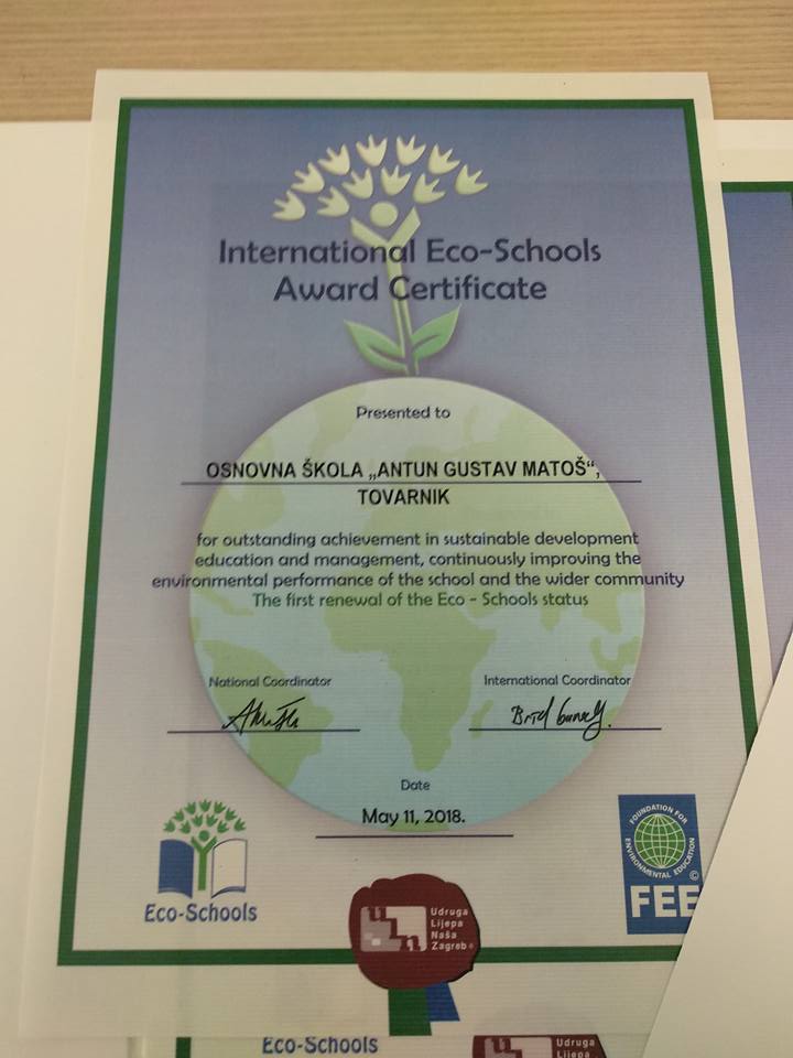 Danas su voditeljica učeničke zadruge "Suncokret"-Snježana Đekić i eko koordinator škole-Petar Ivanković predstavljali školu na ovoj svečanoj smotri. Ovom smotrom potvrđen je kvalitetan rad eko škole i učeničke zadruge. Obnovljen je status Međunarodne eko škole koji sada imamo dvije godine.