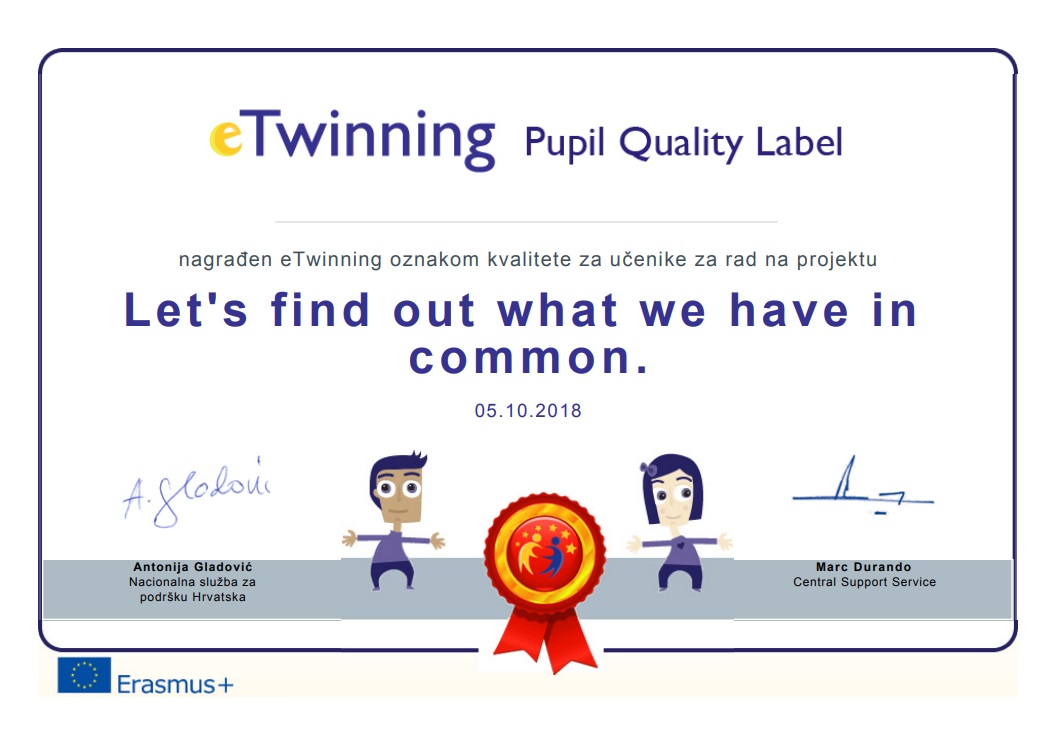 Danas su naši šestaši dobili svoju oznaku kvalitete za uložen trud i rad u prošlogodišnjem projektu "let's find out what we have in common".