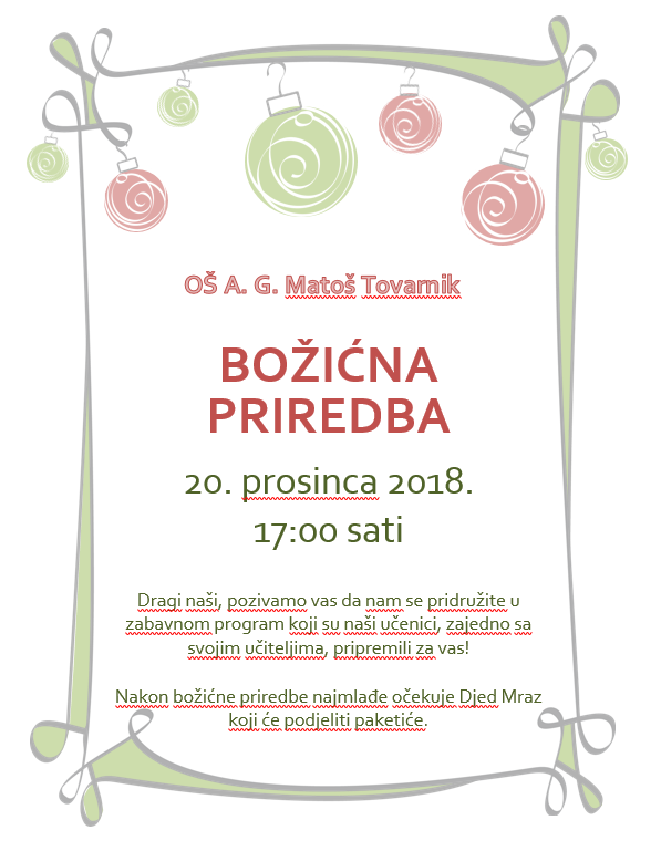 Dana 20. prosinca 2018. (četvrtak) nastava će se održati u poslijepodnevnoj smjeni s početkom u 11.30 sati, a školska priredba povodom predstojećih blagdana održat će se isti dan s početkom u 17.00 sati. Točan raspored zvona pogledajte u prilogu.