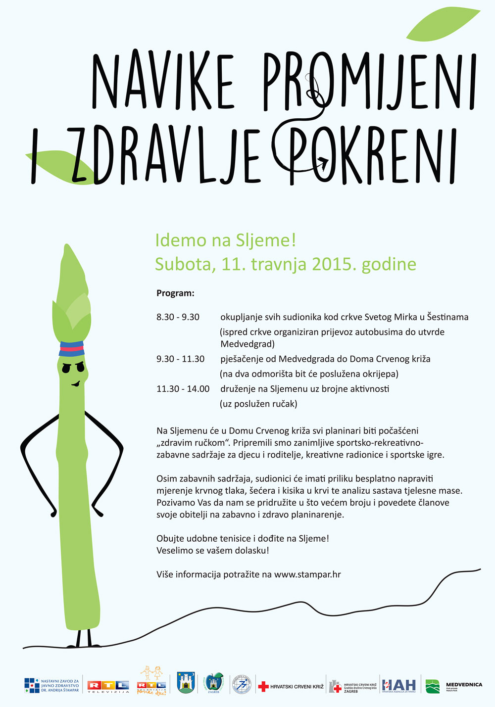 sve zajedno vas pozivamo da se priključite projektu "Navike promijeni, zdravlje pokreni" te nam se pridružite u druženju na Sljemenu, u subotu, 11. travnja 2015. godine.