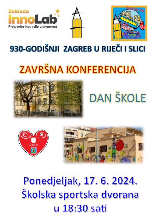 pozivamo vas na proslavu Dana škole, koji će se održati 17. lipnja 2024. u 18:30 u našoj školskoj sportskoj dvorani. U prvom dijelu programa, koji je ujedno i Završna konferencija, bit će prezentirani uradci nastali u okviru provođenja programa "930-godišnji Zagreb u riječi i slici". Nakon toga, u drugom dijelu programa, bit će uručene nagrade učenicima koji su sudjelovali na natjecanjima i tako predstavljali našu školu.