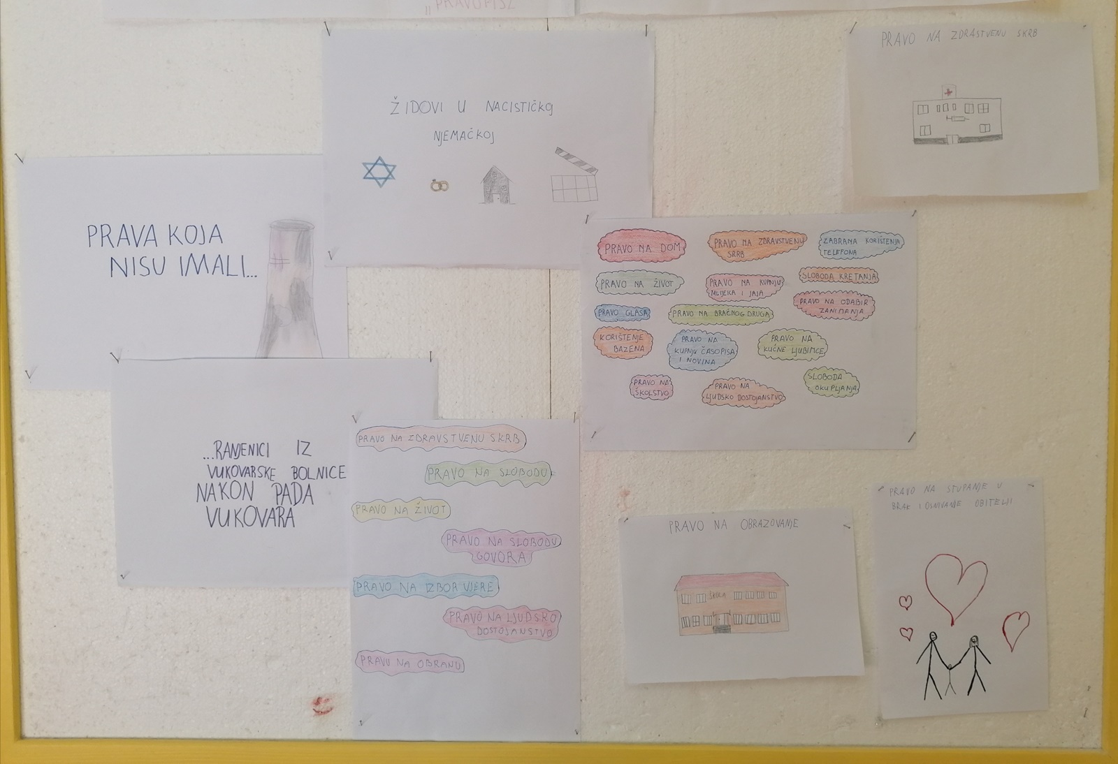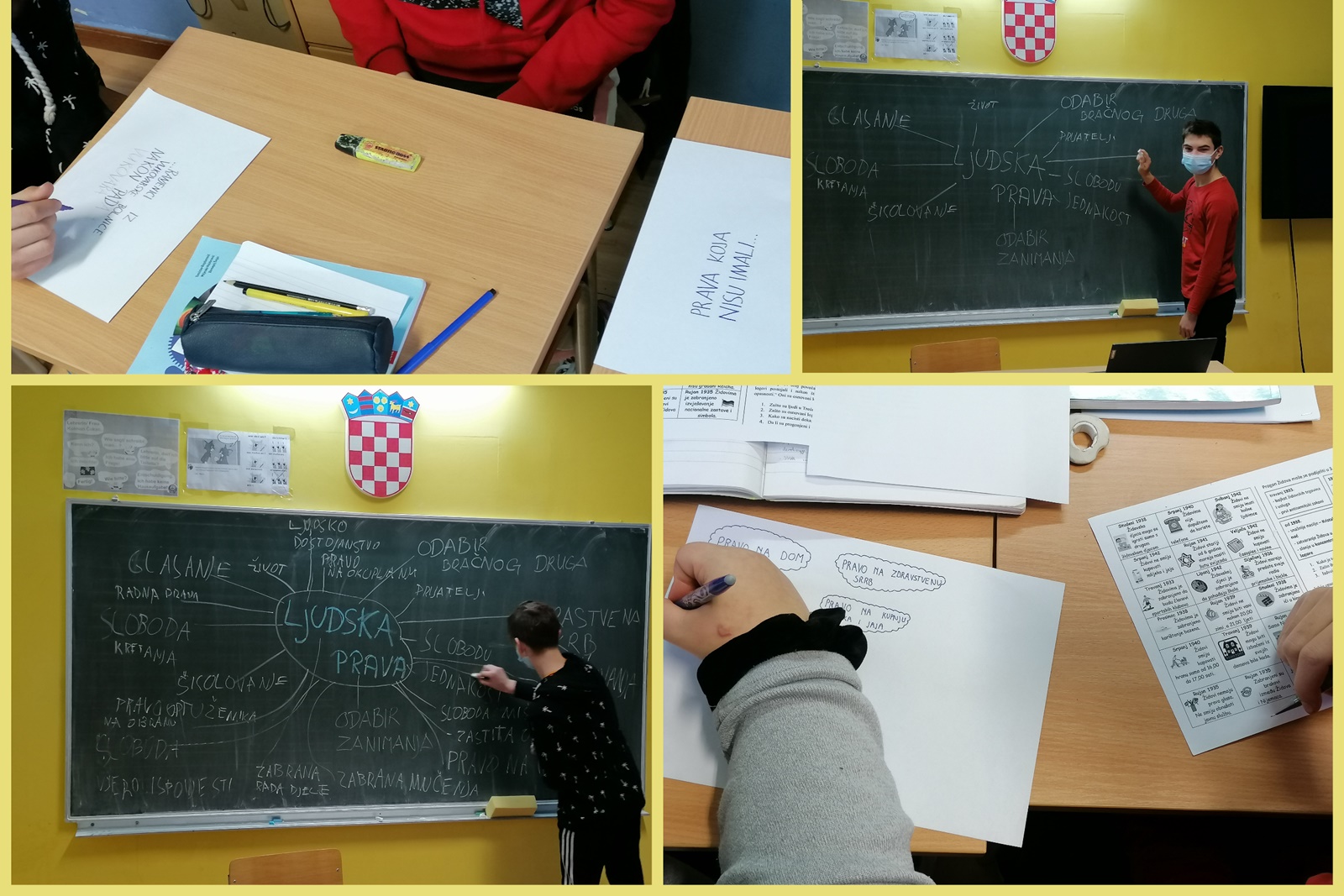 Dana 10. prosinca 1948. godine potpisana je Opća deklaracija UN-a o ljudskim pravima. Upravo se na taj datum svake godine obilježava Međunarodni dan ljudskih prava, prilikom čega se ističe kako svi ljudi ponajprije imaju pravo na život, slobodu i jednakost. U sklopu obilježavanja Dana ljudskih prava nastavili smo poučavati naše učenike o važnosti poticanja tolerancije, međusobnog uvažavanja, poštivanju različitosti, drugih i drugačijih. Tako su se i učenici osmih razreda tijekom prosinca na dodatnoj nastavi iz Povijesti bavili temama vezanim uz ljudska prava. Obilježavanje Dana ljudskih prava povezali smo i s Projektom Šafran čiji su nositelji učenici 8. razreda PŠ Lučelnica te nedavnim predavanjem o Domovinskom ratu. Jedna aktivnost podrazumijevala je da se dio učenika zamisli u ulozi Židova u nacističkoj Njemačkoj, a dio u ulozi ranjenika iz vukovarske bolnice. Učenici su pokušali navesti sva prava koja su im bila prekršena odnosno uskraćena. Dio prava svakog čovjeka učenici su prikazali i slikom odnosno crtežom, a u sklopu posljednje aktivnosti pažnju smo posvetili i dječjim pravima. Razgovorom unutar, ali i diskusijom između skupina, učenici su pokušali pronaći rješenja za probleme s kojima se suočavaju djeca radnici u zemljama Trećeg svijeta. Rješenja koja su učenici ponudili bila su uistinu raznolika, od prikupljanja donacija do obraćanja raznim političarima i institucijama.