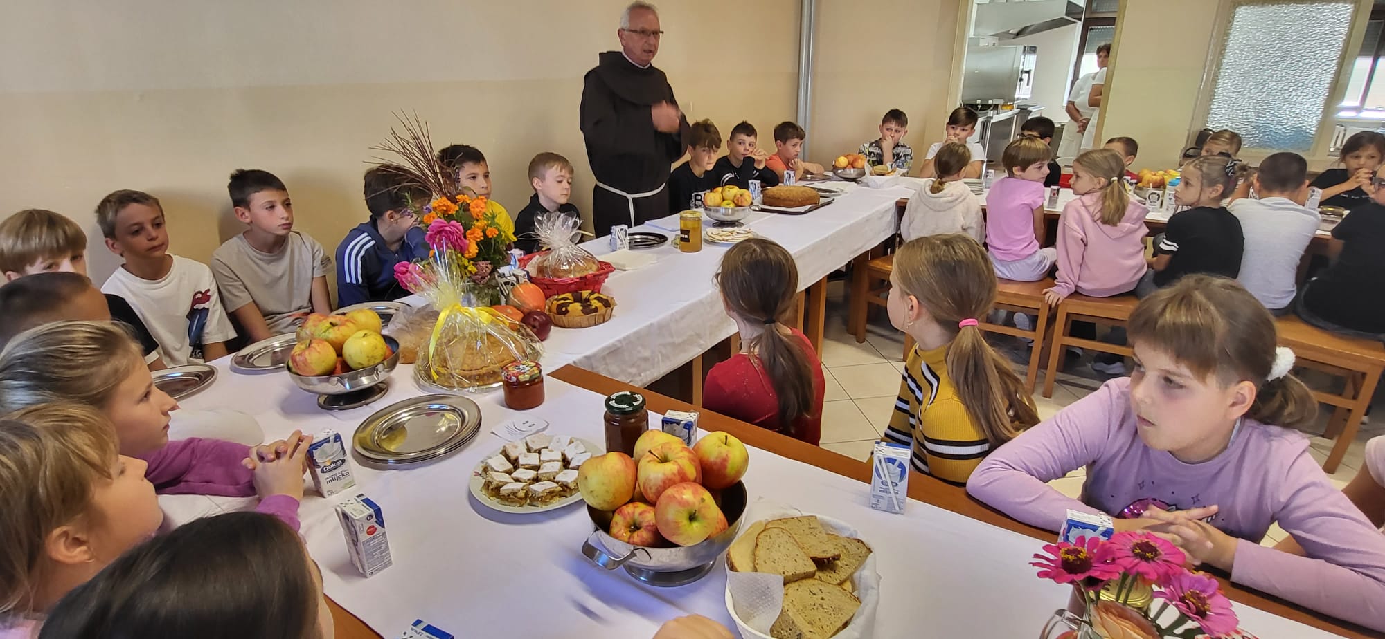 Blago danu koji počne mirisima kruha. Kad se jesen prišulja i zamiriše svojim plodovima, to je znak da moramo zahvaliti svemu što na Zemlji raste i hrani nas. Dan kruha uvijek nas podsjeti da trebamo biti zahvalni Bogu za dar života i prirode, a ove godine proslavili smo ga 12. listopada na malo drugačiji, skromniji način. Marljive ruke polaznika karitativne grupe, vjeroučiteljica i kuharica ispekle su kruh i kolačiće čiji se miris širio školskim hodnicima cijelo jutro. Vrijedne kuharice zamijesile su kruh upotrijebivši kukuruzno, pšenično i obično bijelo brašno te griz i palentu. Vjeroučiteljice i učenici u školi su prije nastave napravili raznovrsne kolačiće s domaćim pekmezom. Župnik fra Drago Brglez blagoslovio je slastice i sve prisutne, a djeca su donijela domaći pekmez te ga mazala na fini, topli kruh. U nastavku pogledajte fotografije.