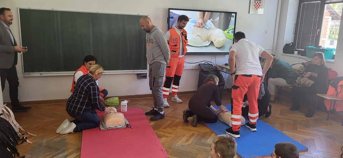 Tim hitne medicinske službe Zavoda za hitnu medicinu Krapinsko-zagorske županije je u ponedjeljak 16. 10. 2023. godine održao kratko predavanje, demonstraciju i praktičnu vježbu prve pomoći za sve učenike sedmih i osmih razreda te učitelje i odgojno-obrazovne djelatnike. Cilj je bio osvijestiti važnost pružanja prve pomoći očevidaca unesrećenoj osobi do dolaska hitne medicinske službe. Učenici i učitelji vrlo su pozorno slušali i pratili predavanje i vježbe. Naučili smo algoritam pružanja pomoći jer nitko od nas ne zna kad bi nam to znanje moglo zatrebati. Većina je prisutnih praktično uvježbavala postavljanje unesrećenog na bok te korake za osobnu sigurnost i sigurnost unesrećenog, traženje pomoći, pozivanje Hitne medicinske pomoći na tel. broj 194 i pružanje pomoći unesrećenom.Imali smo priliku vidjeti i upotrebu automatskog vanjskog defibrilatora u slučaju iznenadnog srčanog zastoja. Ravnatelj Zavoda za hitnu medicinsku pomoć gosp. Krešimir Božić istaknuo je da se intervencijom unutar tri do pet minuta od trenutka zastoja srca mogućnost preživljavanja povećava za više od 50 posto, istaknuo je ozbiljnost i težinu problema iznenadnog srčanog zastoja te kako prisutni mogu unesrećenom spasiti život pomažući mu do dolaska hitne pomoći. Zahvaljujemo našim gostima na dolasku, na ovom vrijednom predavanju i demonstraciji te na njihovom predanom i humanom svakodnevnom radu. Fotografije su u prilogu.