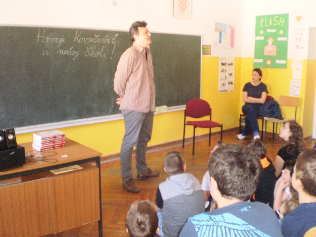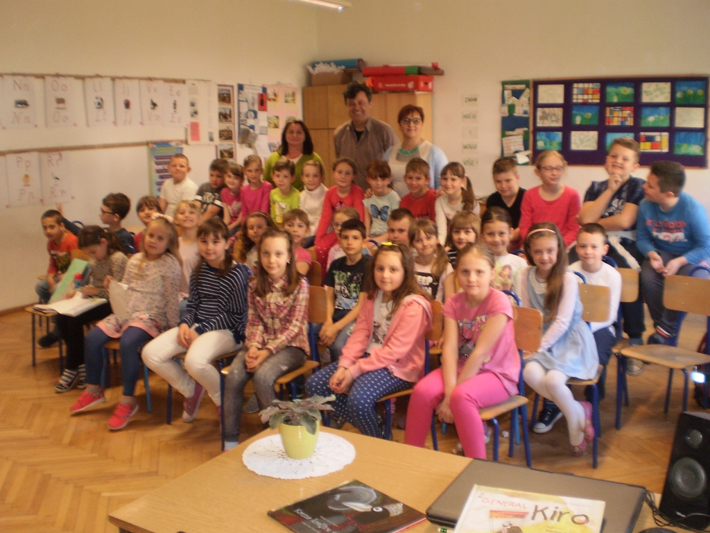 Zahvaljujući prijateljstvu gospođe Snježane Horvatin i književnika Hrvoja Kovačevića te u organizaciji knjižničarke naše škole Marice Lojen, u petak 31.3. 2017. pisac Hrvoje Kovačević održao je tri književna susreta s učenicima naše škole. U Klanjcu je najprije predstavio knjigu „General Kiro miš“ za učenike 1. i 2. razreda. Bilo je prekrasno jer su učenici imali puno pitanja i pažljivo su slušali autora koji je svojom zanimljivom pričom objasnio zašto je čitanje važno, zašto se treba družiti s knjigom te koliko roditelji mogu učiniti da čitanje knjiga bude veselje djeci. Njegova mu je majka redovito čitala dok je bio mali dječak u Požegi. Knjiga mu je najdraži medij jer si uz nju sam sa slovima i bijelim papirom te sam čitajući ulaziš u događaj, dodaješ i boje i zvukove, zamišljaš prostor s likovima kojima daješ oblik, godine, sudjeluješ u radnji. Čitanje preporuča svima te savjetuje da s njime nikad ne prestanemo. Citirao je i svoju omiljenu misao pisca Cervantesa: „Nije važno koliko si knjiga napisao, važno je koliko si knjiga pročitao“.
