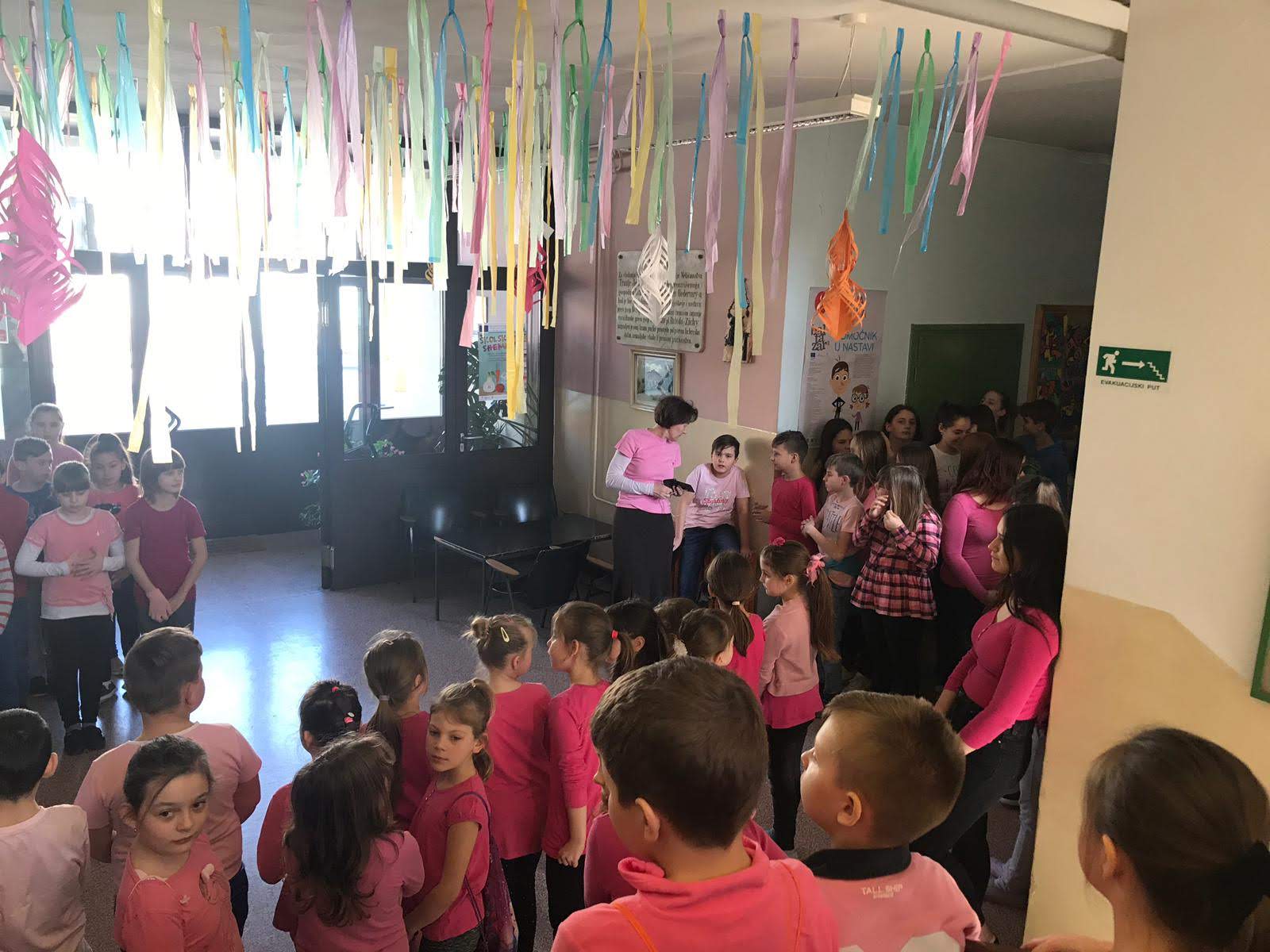 27. veljače obilježili smo Dan ružićastih majica. Između svakog sata na hodnicima naše škole nastupali su učenici od 1. do 6. razreda. Pjevali su, plesali, recitirali i sve nas zabavili svojim nastupima. Najavljivali su ih putem školskog razglasa učenice Petra Lepej i Patricia Štih, članice novinarske grupe. Nika Sinković i Paula Drčić