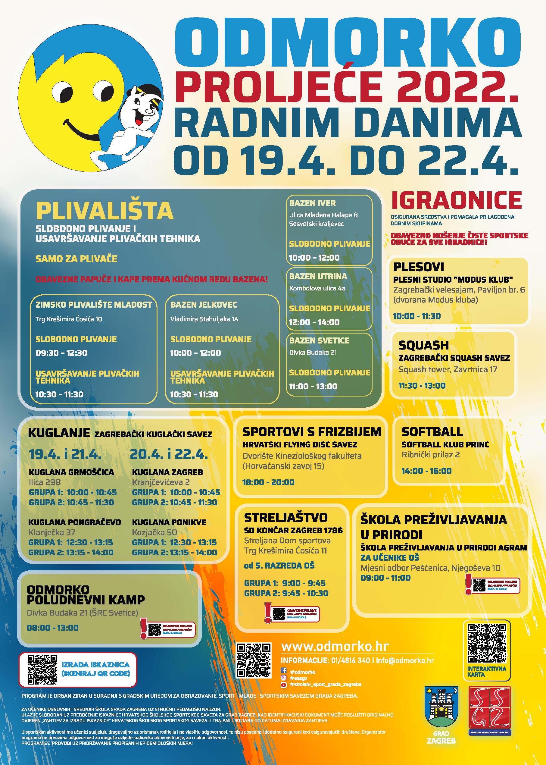 Školski sportski savez Grada Zagreba za vrijeme proljetnog odmora učenika organizira besplatne sportske aktivnosti u sklopu programa Odmorko proljeće 2022. Učenicima smo pripremili sljedeće sportske aktivnosti: slobodno plivanje i usavršavanje plivačkih tehnika (Zimsko plivalište Mladost i bazen Jelkovec) slobodno plivanje (bazen Iver, bazen Utrina, bazen Svetice) , kuglanje, squash, streljaštvo, škola preživljavanja u prirodi, plesovi, softball, sportovi s frizbijem te odmorko poludnevni kamp. Za aktivnosti streljaštva, odmorko poludnevnog kampa te škole preživljavanja u prirodi potrebne su prethodne prijave preko mrežne stranice Saveza. Sudjelovanje u aktivnostima je besplatno uz predočenje važeće iskaznice ili zahtjeva za izradu iskaznice Hrvatskog školskog sportskog saveza za Grad Zagreb. Upute za izradu iskaznica nalaze se na sljedećoj poveznici.