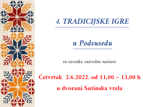 Poštovani roditelji i posjetitelji mrežnih stranica naše škole, OŠ bana Josipa Jelačića u suradnji s KUD-om Klas, Podsused- Zagreb organizira Tradicijske dječje igre za učenike razredne nastave. U igrama sudjeluju i gosti - učenici OŠ Dragutina Domjanića, OŠ Stenjevec, OŠ Dragutina Tadijanovića i OŠ grofa Janka Draškovića. Tradicijske dječje igre održat će se u četvrtak, 2.6.2022. godine od 11 sati do 13 sati u Sportskoj dvorani Sutinska vrela. Dođite i podržite nas!