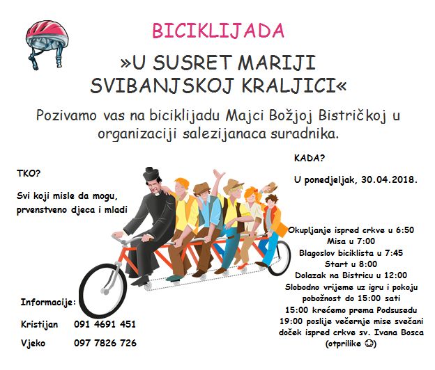 Drage učenice i učenici, dragi roditelji! U ponedjeljak 30. travnja 2018. je nenastavni dan. Svi, koji žele, se mogu pridružiti i sudjelovati u biciklijadi! Jelena Ivaci