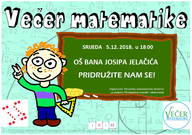 U srijedu, 5.12.2018.g., u 18.00 sati u našoj će se školi održati Večer matematike u organizaciji HMD-a i nastavnica matematike te učitelja i učiteljica naše škole. Pozivamo sve učenicke da dođu i zabave se uz matematičke igre. Prošle godine pridružilo nam se više od 300 učenika i njihovih roditelja. Pripremili smo više od 40 radnih centara na kojima se mogu zabaviti učenici, ali i njihovi roditelji. Atmosferu s prošlogodišnje Večeri matematike možete vidjeti ovdje. Nastava će taj dan biti skraćena 0. 1. 2. 3. 4. 5. 6. 8.00 – 8.35 8.40 – 9.15 9.25 – 10.00 10.10 – 10.45 10.50 – 11.25 11.30 - 12.05 12.10 – 12.45 12.50 – 13.25 13.30 - 14.05 14.15 – 14.50 15.00 – 15.35 15.40 – 16.15 16.20 – 16.55 Raspored učionica po razredima bit će izvješen na oglasnoj ploči na dan održavanja. Veselimo se vašem dolasku i nadamo se da ćete se lijepo provesti i zabaviti uz matematiku. Zvijezdana Markoljević