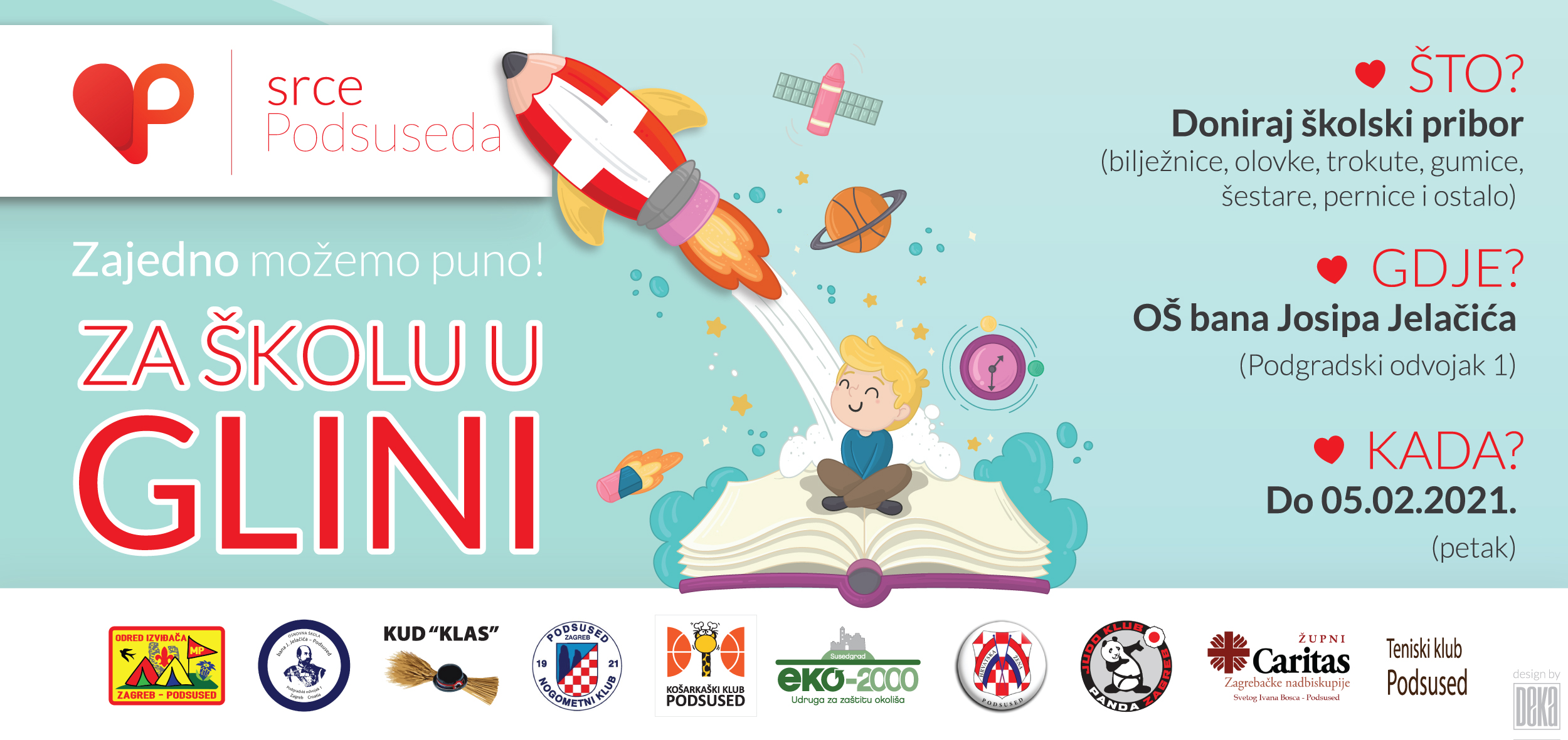 Poštovani, od srca zahvaljujem svima koji su sudjelovali u humanitarnoj akciji Đak za đaka, vršnjak za vršnjaka! Želja za pomoći stradalima u potresu udružila je lokanu zajednicu Podsuseda u Srce Podsuseda te nastavljamo zajedničkim snagama u humanitarnim akcijama. Slijedeća zajednička akcija je SRCE PODSUSEDA ZA ŠKOLU U GLINI, a odnosi se na skupljanje školskog pribora ili novčanih priloga za školski pribor. Doniranje školskog pribora bit će moguće u predvorju škole u kutije postavljene za tu svrhu. Novčane priloge učenici mogu predati svojim razrednicima. Akcija traje do 5.2.2021. godine! ZAJEDNO MOŽEMO PUNO!