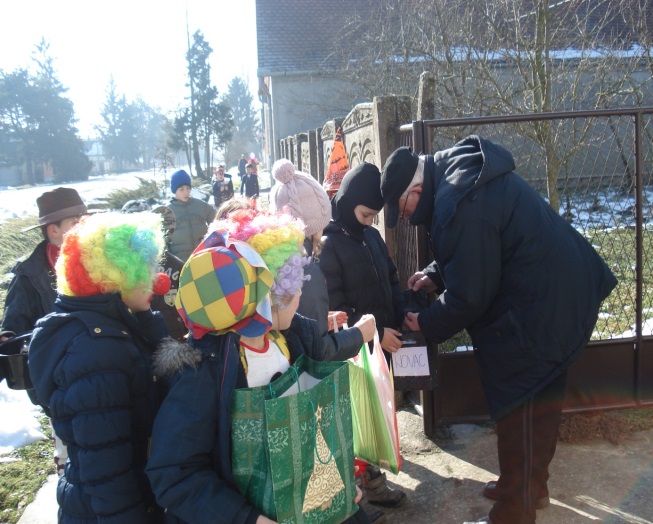 Bili su to učenici naše škole koji su organizirali maskenbalsku povorku da prošeta selom i podsjeti mještane na običaje iz prošlosti, održavanje maskenbala. Radosno su dočekani i bogato nagrađeni. Košarice su se brzo punile jabukama, slatkišima, jajima, a bilo je i nešto novca. Radosni i sretni prošli smo kroz cijelo selo. Znatno umorni stigli smo do škole gdje smo se okrijepili slatkišima i toplim čajem.